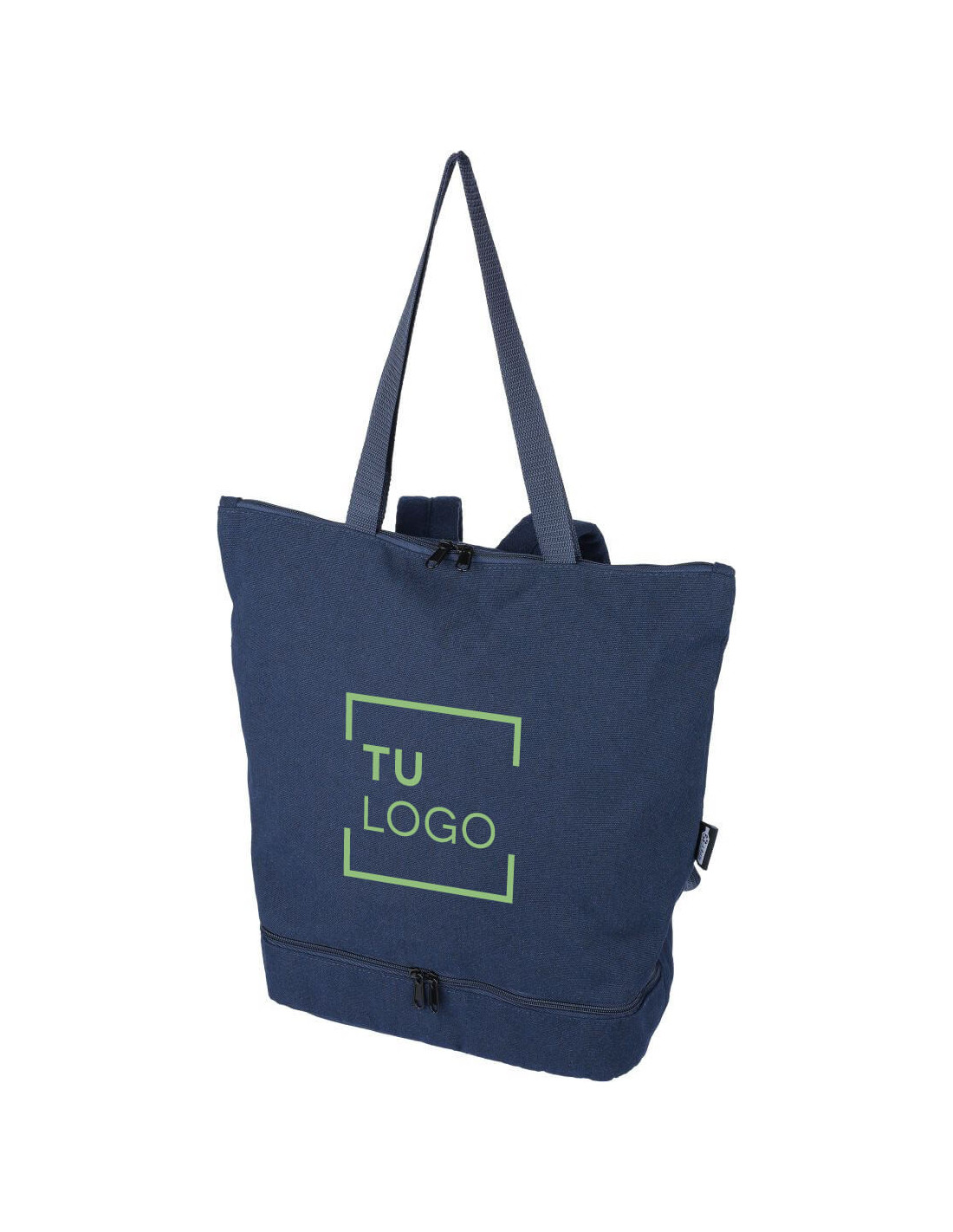 Mochila tote de gran capacidad fabricada en polialgodón reciclado (330 g/m²), perfecta para el día a día o escapadas. Su diseño híbrido permite llevarla como mochila o como tote bag gracias a sus asas largas y correas acolchadas ajustables. Incluye un compartimento principal con cremallera, y bolsillo en la base con cremallera independiente, compartimentos interiores y bolsillo exterior. Forro interior en poliéster reciclado 210D. Capacidad de 30 L y carga máxima de 15 kg. Producto sostenible con etiqueta de material reciclado. Ideal para marcas comprometidas con el medio ambiente.