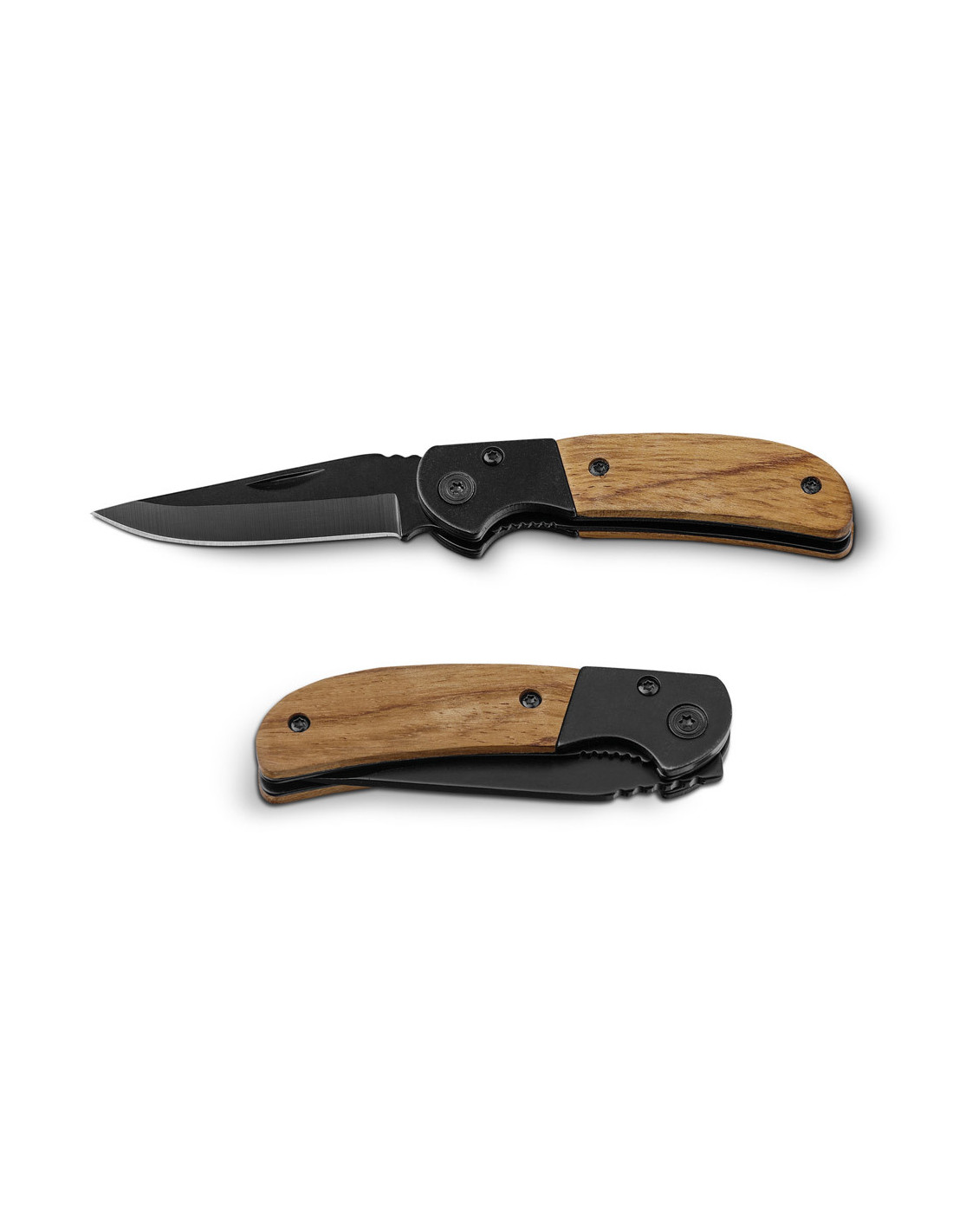 Navaja fabricada en acero inoxidable con elegante empuñadura de madera, equipada con cierre de seguridad para un uso fiable. Su diseño compacto la hace ideal para actividades al aire libre, uso diario o como regalo promocional. Se presenta en una caja de regalo, aportando un acabado cuidado y listo para entregar. Al estar elaborada con materiales naturales, el color y el resultado de la impresión pueden variar en cada pieza, aportando un carácter único. Medidas: 8,4 x 1,1 x 2,4 cm.