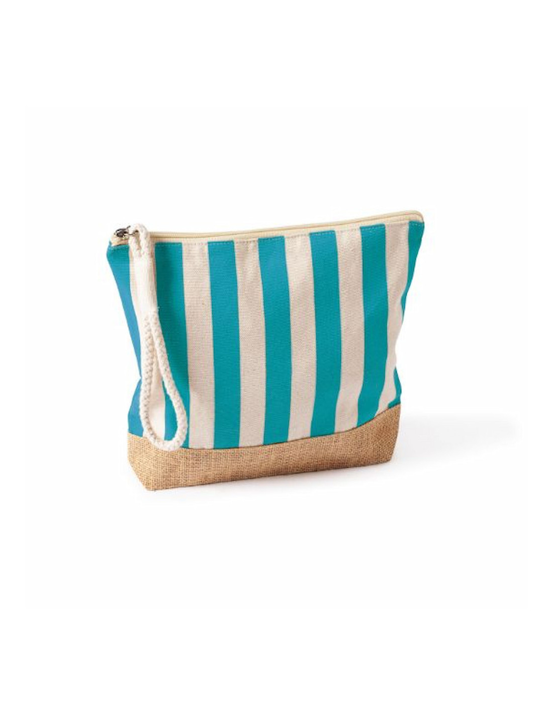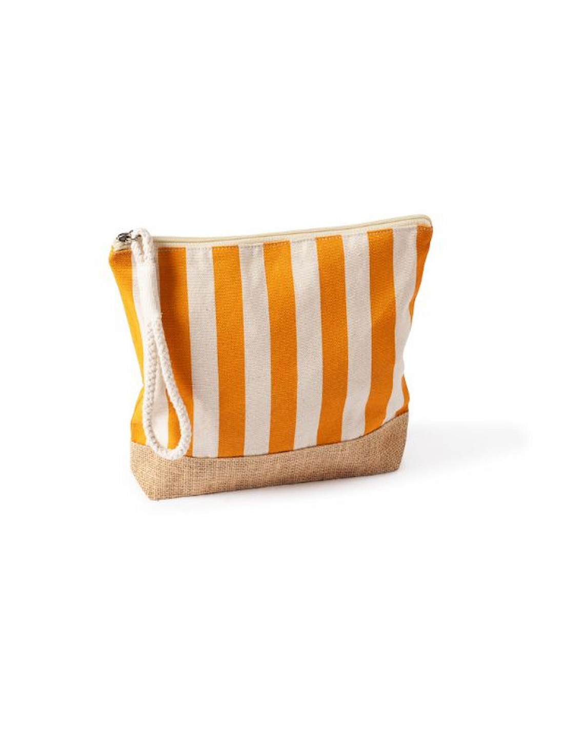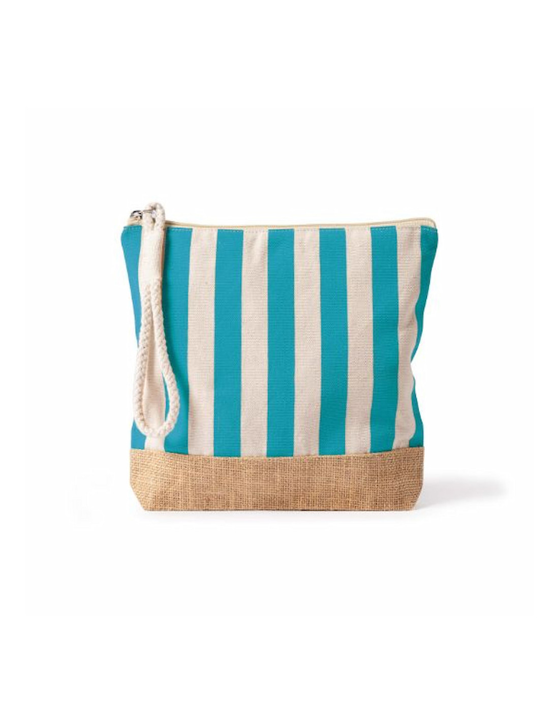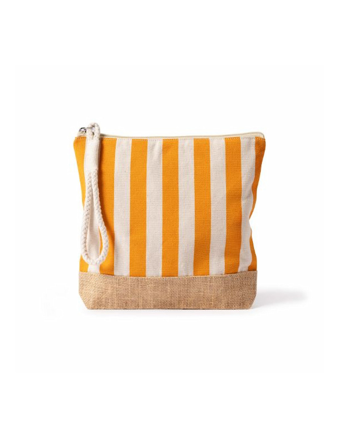 Neceser a rayas fabricado en algodón reciclado y yute de 220 g/m², resistente y con acabado natural ideal para acciones promocionales y uso diario. Dispone de compartimento principal con cierre de cremallera y tirador de cordón que facilita su apertura y manejo. Su formato práctico permite organizar artículos de higiene, cosmética o pequeños accesorios en viajes y eventos. Medidas: 25 x 4 x 23 cm.