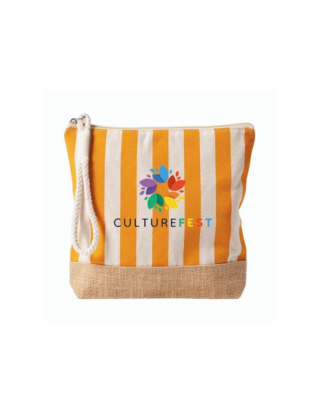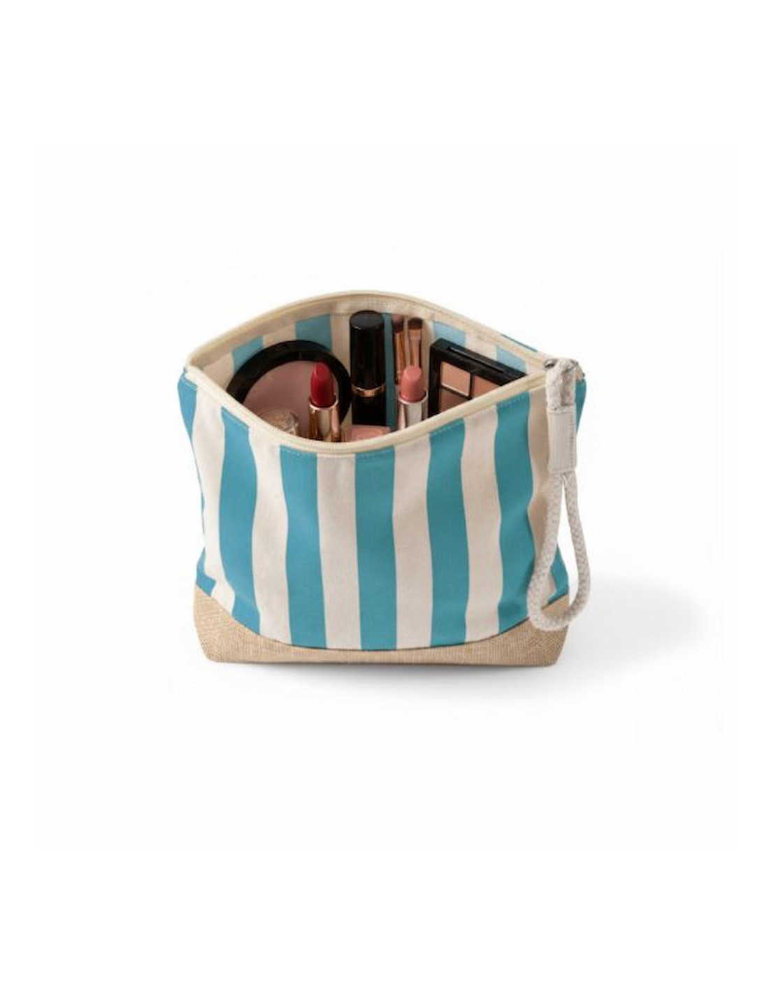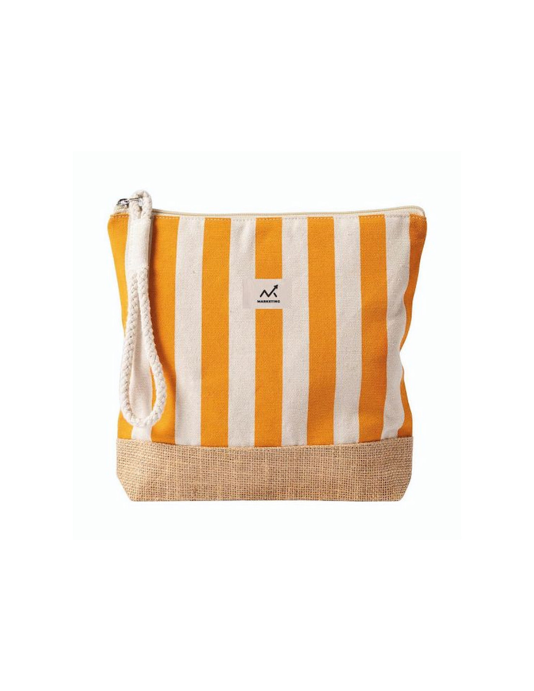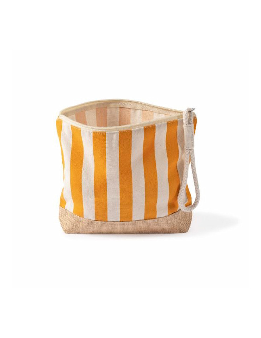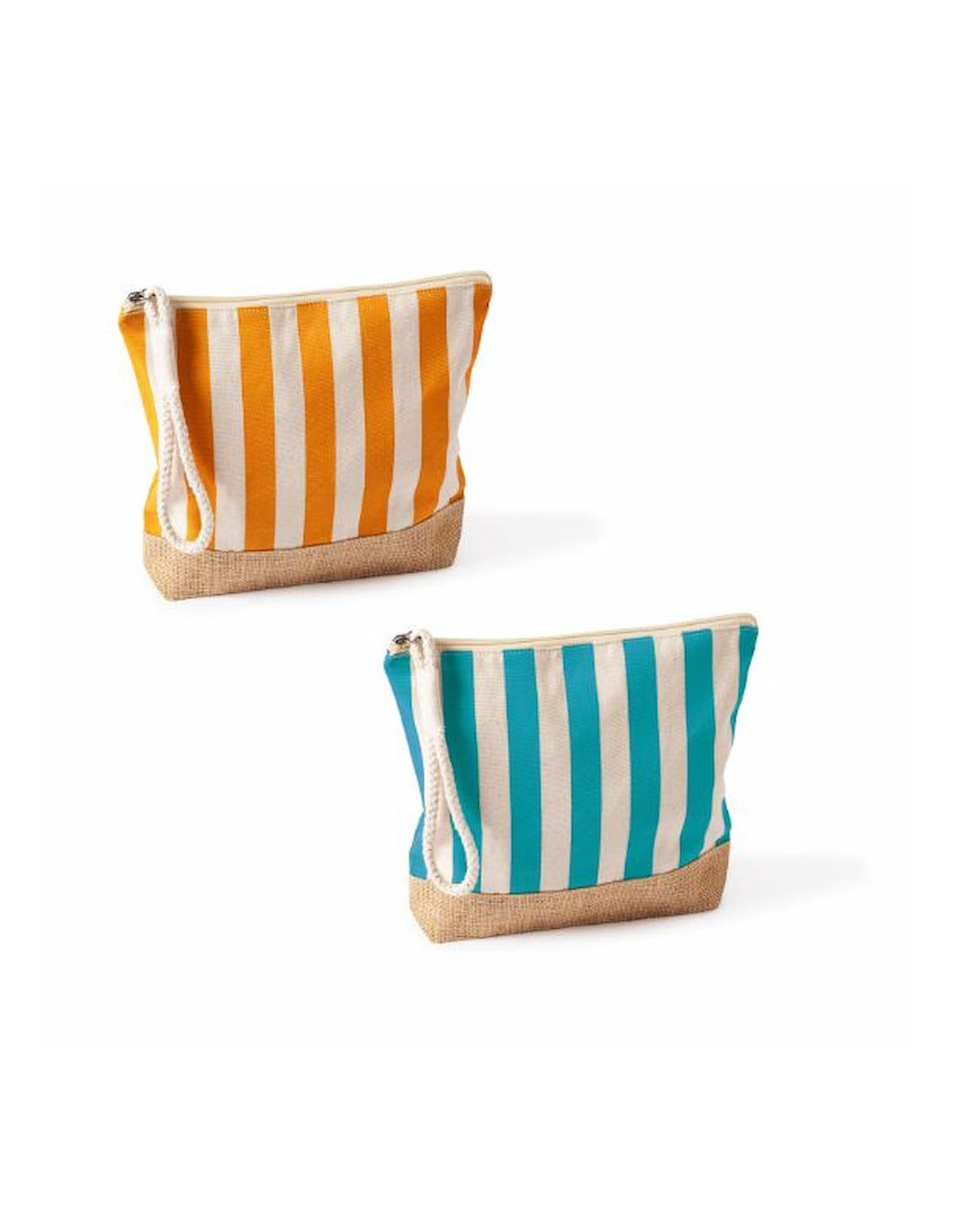 Neceser a rayas fabricado en algodón reciclado y yute de 220 g/m², resistente y con acabado natural ideal para acciones promocionales y uso diario. Dispone de compartimento principal con cierre de cremallera y tirador de cordón que facilita su apertura y manejo. Su formato práctico permite organizar artículos de higiene, cosmética o pequeños accesorios en viajes y eventos. Medidas: 25 x 4 x 23 cm.