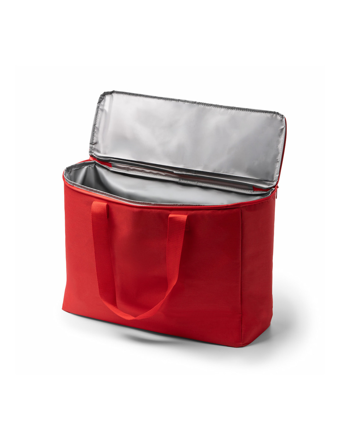 Nevera de tamaño familiar fabricada en RPET 600D, diseñada para ofrecer gran capacidad y mantener alimentos y bebidas a la temperatura óptima durante más tiempo. Cuenta con cierre de cremallera en toda su apertura, lo que facilita el acceso y la organización del contenido. Incorpora asa doble de 70 cm con refuerzo, garantizando un transporte cómodo y seguro incluso con carga. Su interior isotérmico la convierte en la opción ideal para picnic, playa, viajes o uso diario. Con unas dimensiones aproximadas de 47 x 33 x 17 cm, es una nevera práctica, resistente y sostenible.