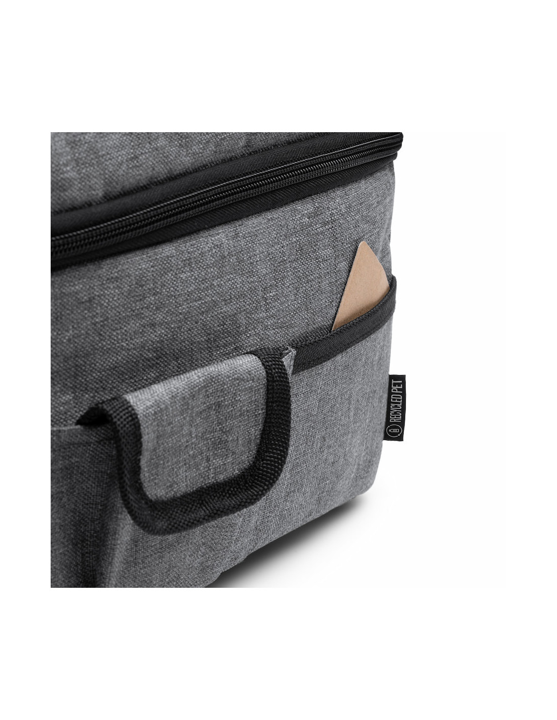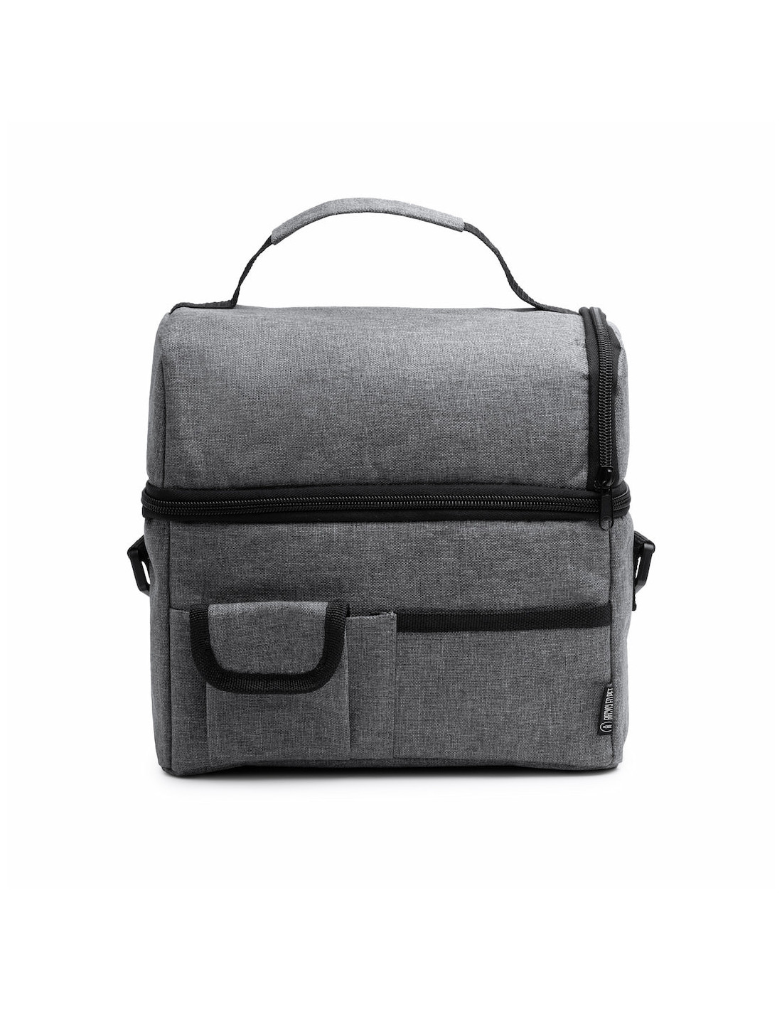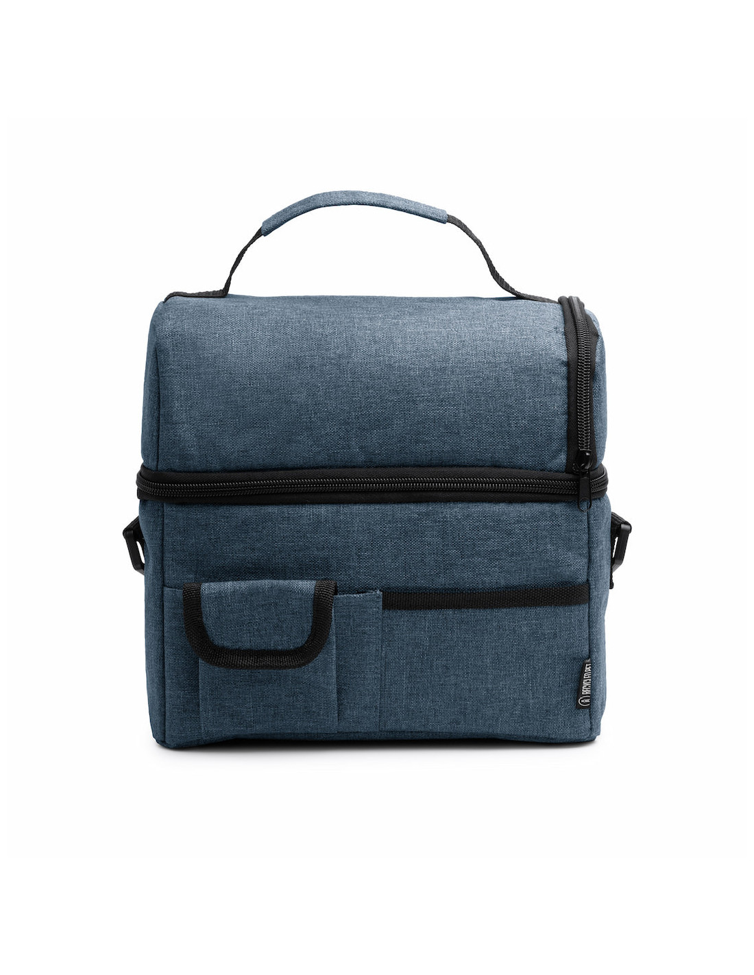 Nevera multiusos fabricada en RPET 600D, diseñada para mantener alimentos y bebidas a la temperatura adecuada durante más tiempo gracias a sus compartimentos interiores isotérmicos. Cuenta con bolsillos exteriores que ofrecen espacio adicional para utensilios, servilletas o pequeños snacks. Incorpora una cómoda cinta bandolera acolchada y ajustable con mosquetón, que facilita su transporte y aporta versatilidad en su uso. Con unas dimensiones aproximadas de 25 x 24 x 15 cm, es ideal para excursiones, trabajo, playa o uso diario, combinando funcionalidad y sostenibilidad.