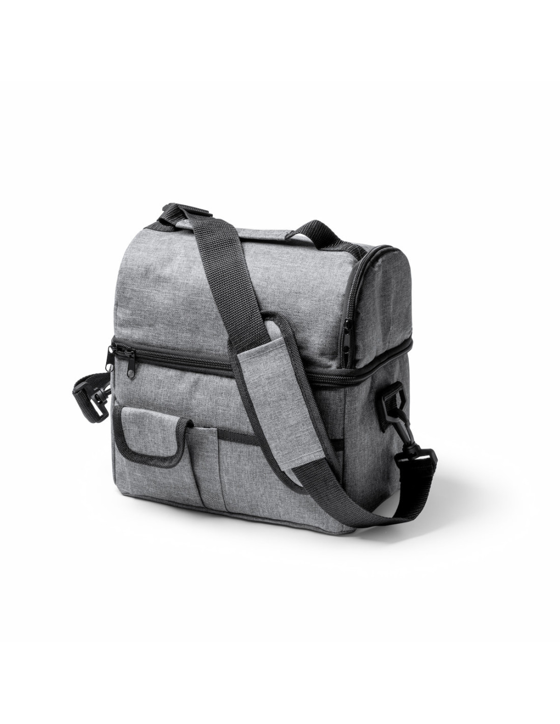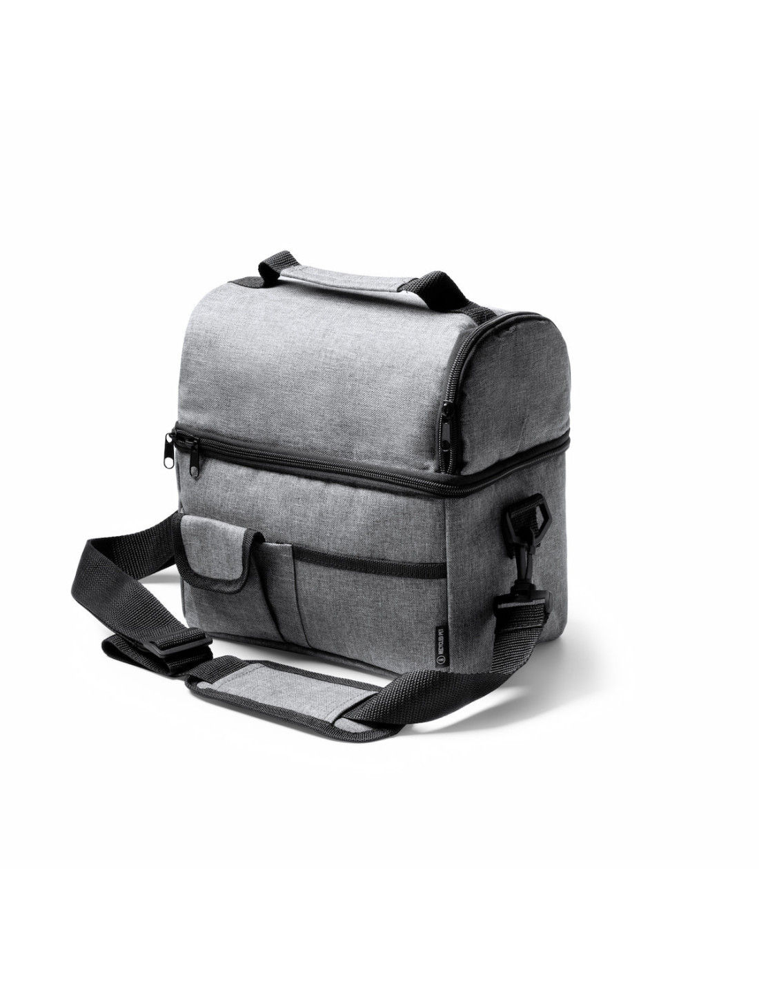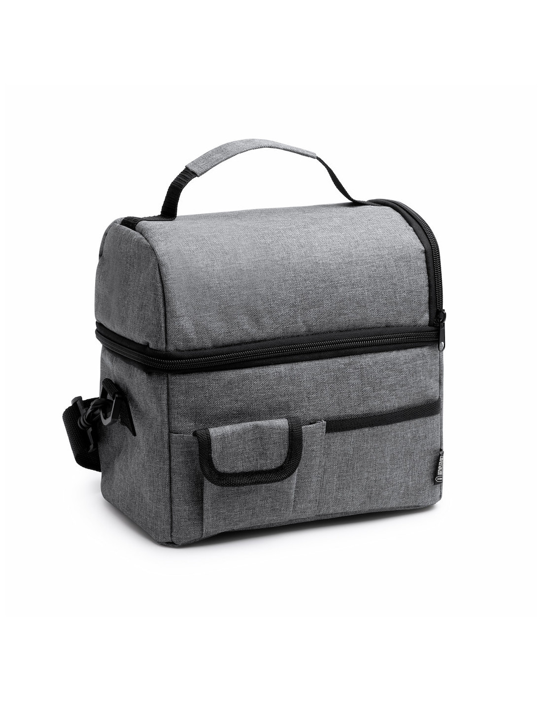 Nevera multiusos fabricada en RPET 600D, diseñada para mantener alimentos y bebidas a la temperatura adecuada durante más tiempo gracias a sus compartimentos interiores isotérmicos. Cuenta con bolsillos exteriores que ofrecen espacio adicional para utensilios, servilletas o pequeños snacks. Incorpora una cómoda cinta bandolera acolchada y ajustable con mosquetón, que facilita su transporte y aporta versatilidad en su uso. Con unas dimensiones aproximadas de 25 x 24 x 15 cm, es ideal para excursiones, trabajo, playa o uso diario, combinando funcionalidad y sostenibilidad.