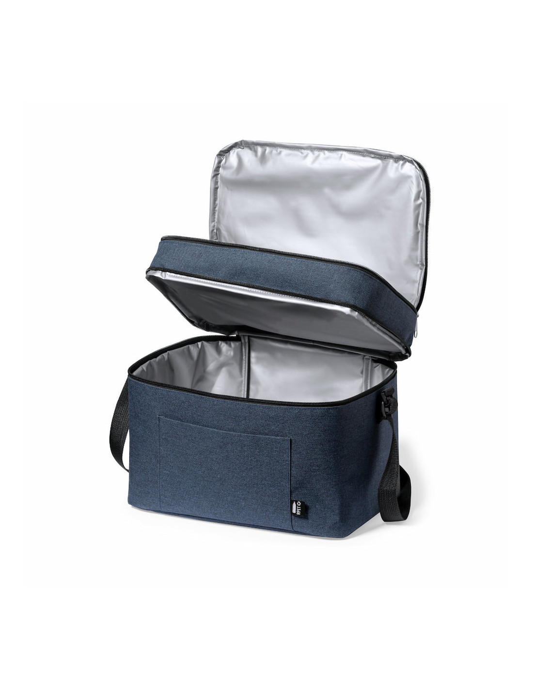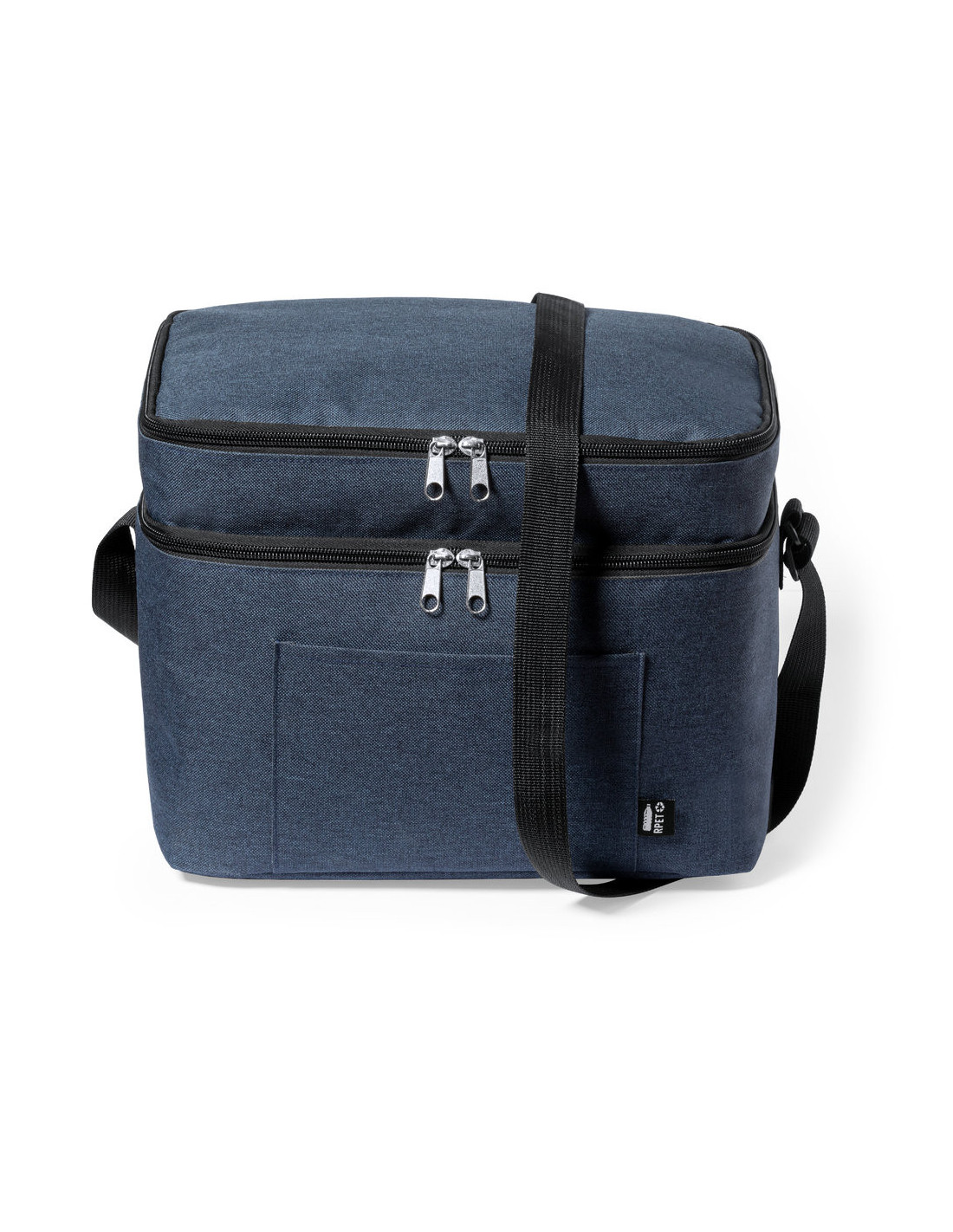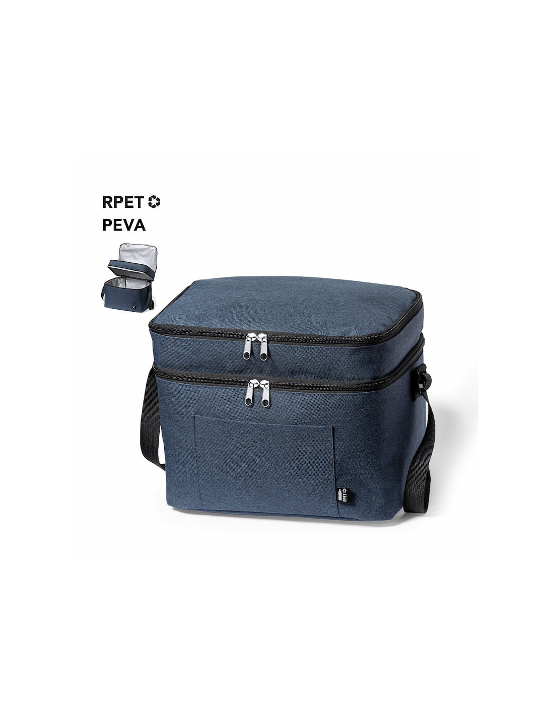 Nevera portátil fabricada en resistente poliéster 600D RPET, un material sostenible elaborado a partir de plástico reciclado que contribuye a la reutilización de residuos y al cuidado del medio ambiente. Incorpora dos compartimentos independientes con cierre de cremallera y doble tirador metálico, lo que permite organizar alimentos y bebidas de forma práctica. Su interior isotermo en PEVA ayuda a mantener la temperatura durante más tiempo. Dispone además de cinta bandolera ajustable para un transporte cómodo y un bolsillo exterior para guardar pequeños accesorios. Disponible en una variada gama de colores e incluye etiqueta exterior con distintivo RPET que destaca su carácter ecológico. Medidas: 30 x 24 x 19,5 cm.