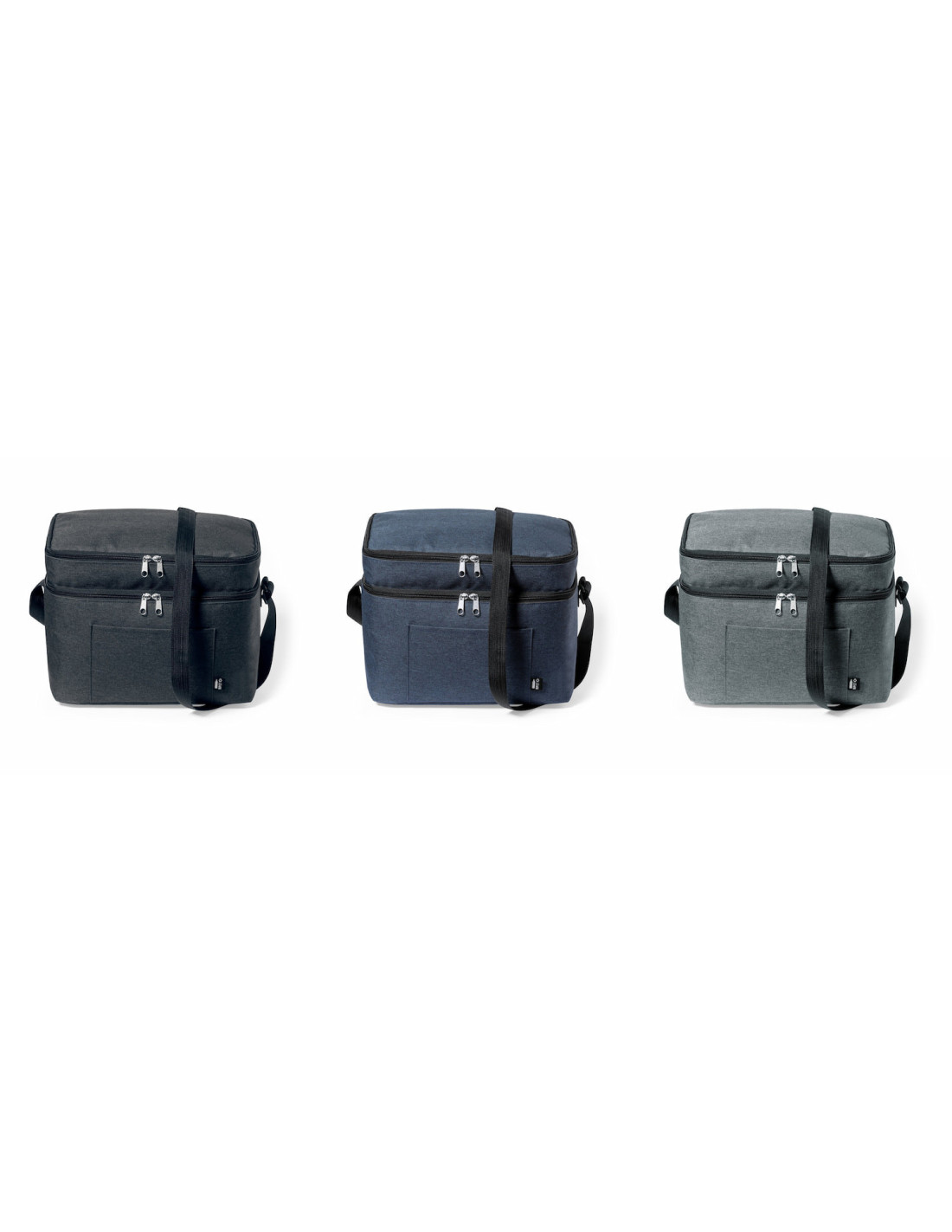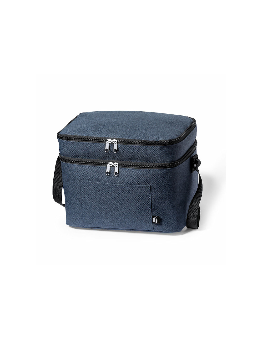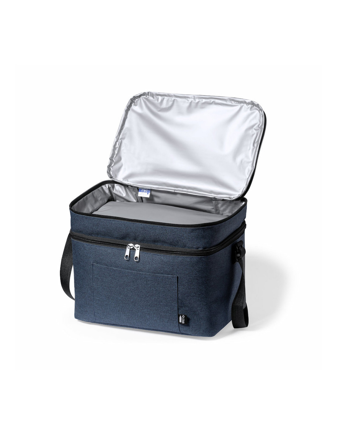Nevera portátil fabricada en resistente poliéster 600D RPET, un material sostenible elaborado a partir de plástico reciclado que contribuye a la reutilización de residuos y al cuidado del medio ambiente. Incorpora dos compartimentos independientes con cierre de cremallera y doble tirador metálico, lo que permite organizar alimentos y bebidas de forma práctica. Su interior isotermo en PEVA ayuda a mantener la temperatura durante más tiempo. Dispone además de cinta bandolera ajustable para un transporte cómodo y un bolsillo exterior para guardar pequeños accesorios. Disponible en una variada gama de colores e incluye etiqueta exterior con distintivo RPET que destaca su carácter ecológico. Medidas: 30 x 24 x 19,5 cm.