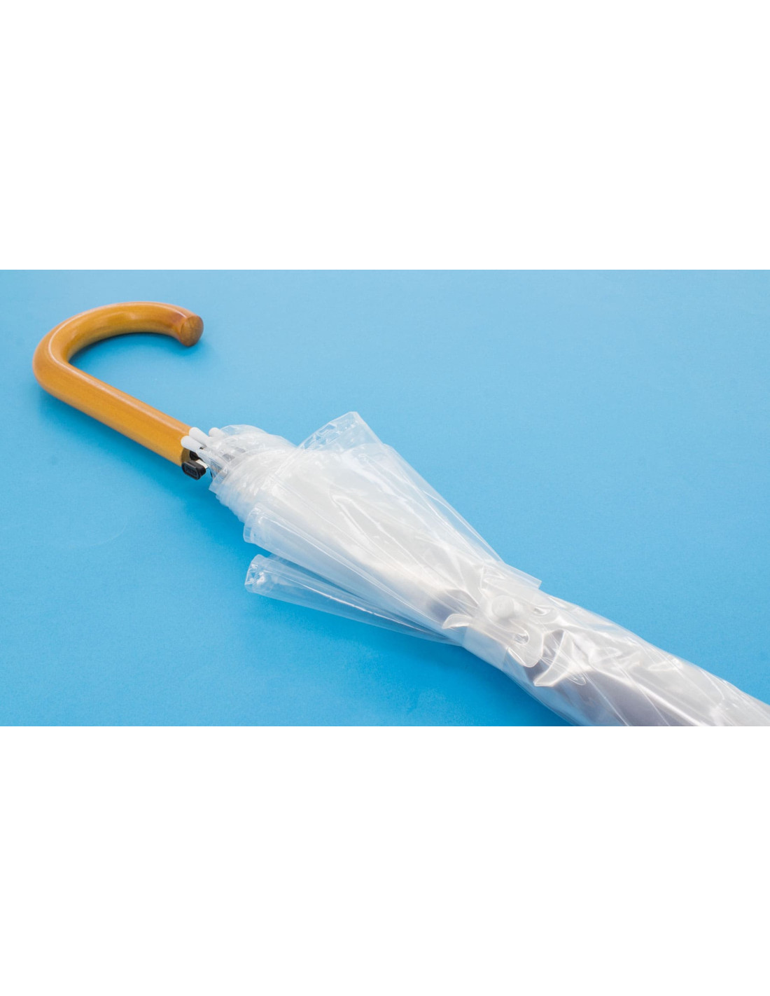 Paraguas transparente automático fabricado en PVC de 8 paneles, apertura automática y diámetro de 100 cm. Este paraguas transparente es ideal para los días de lluvia. Modelo cómodo con empuñadura de bastón en color madera y punta a juego. Presentación en bolsa individual transparente. Descubre nuestros paraguas transparentes fabricados en PVC de alta calidad, con apertura automática y gran diámetro de 100 cm. Ideales como regalo promocional, estos paraguas te protegerán de la lluvia con estilo. ¡Compra ahora y destaca con regalos promocionales con tu marca únicos!