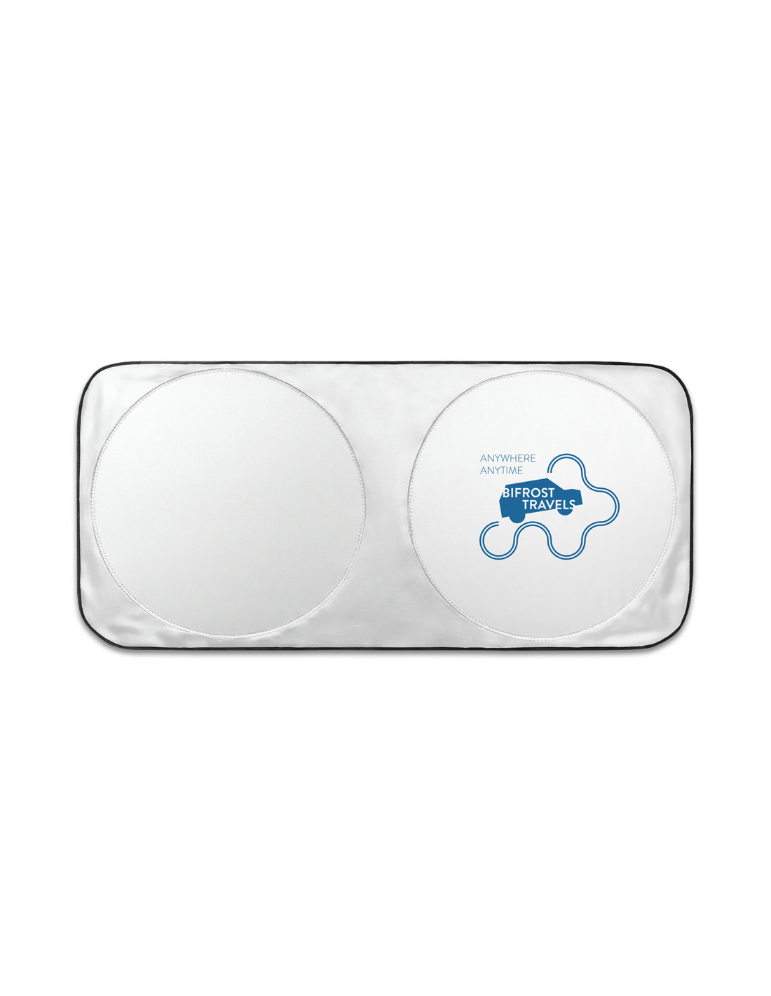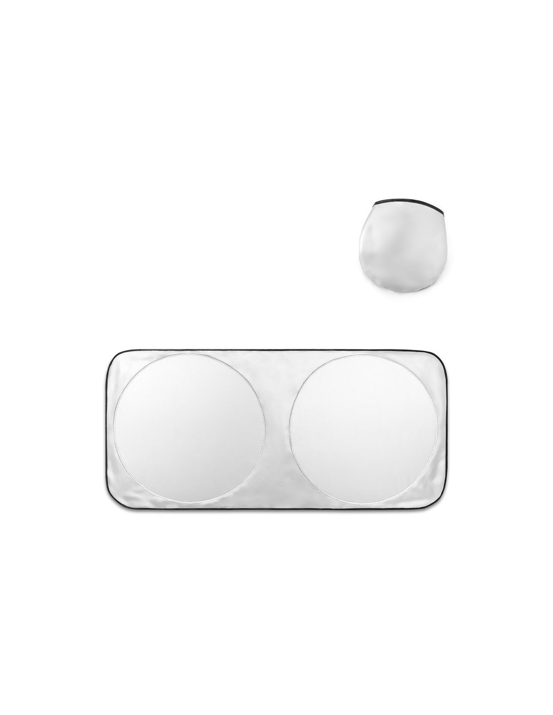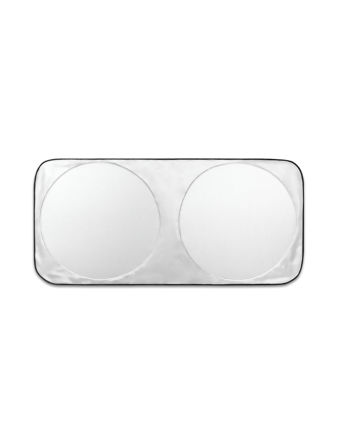 Parasol para coche fabricado en poliéster 210D, diseñado para proteger el interior del vehículo del calor y la radiación solar. Su formato con dos áreas circulares de 65 cm de diámetro se adapta fácilmente al parabrisas, ofreciendo una cobertura eficaz en los días más calurosos. Ligero y práctico, se pliega cómodamente y se presenta en una bolsa de poliéster 210D para facilitar su almacenamiento y transporte. Medidas: 150 x 70 cm.