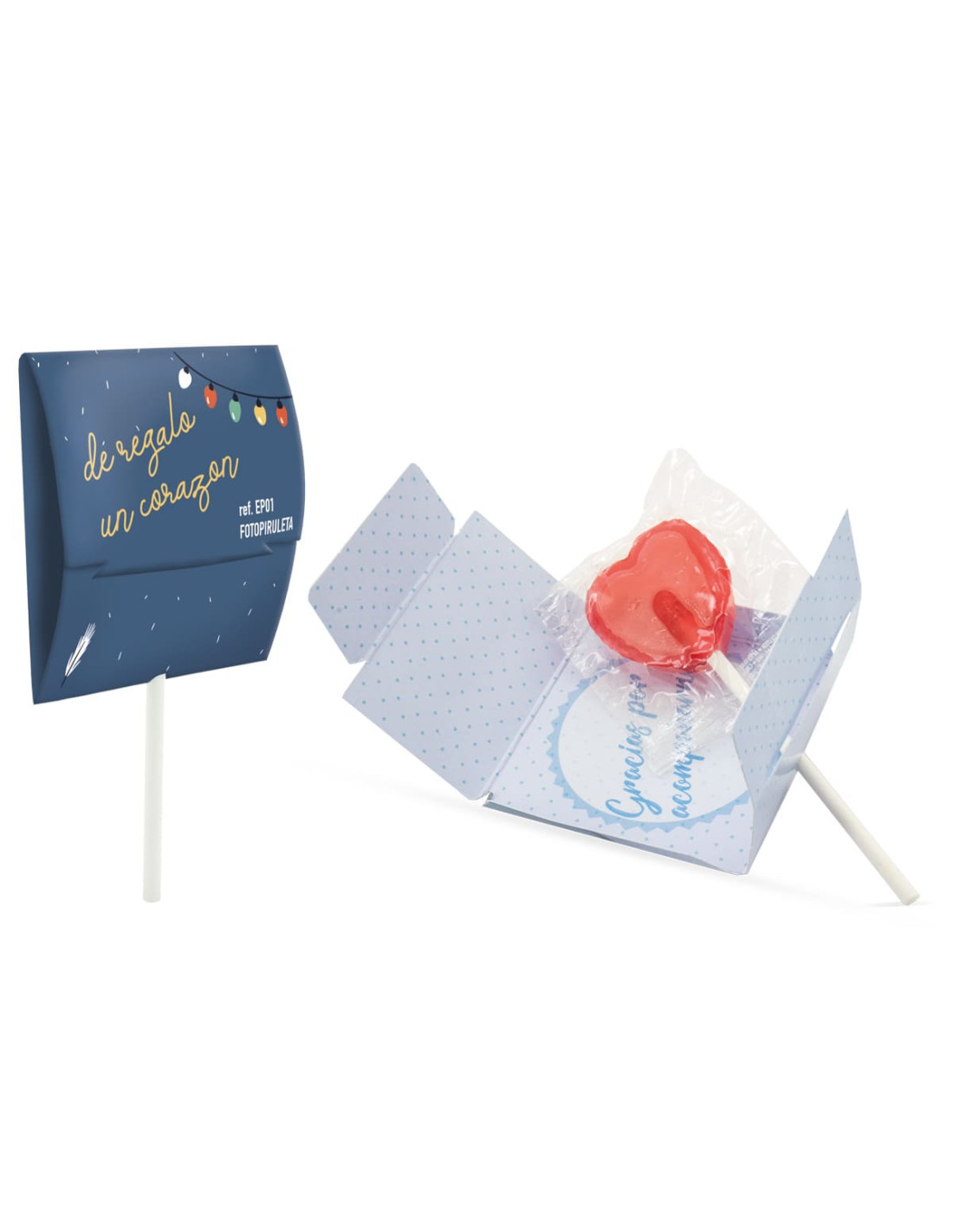 La piruleta de corazón sin azúcar con envase personalizado es un detalle original y dulce perfecto para eventos, celebraciones y acciones promocionales. Con un formato compacto de 5,8 x 5,8 cm cerrada, permite una impresión a todo color de alta calidad, ideal para personalizar con logotipos, fotografías o mensajes especiales. Está elaborada en papel couche de 350 gr/m² con plastificado brillo a una cara, ofreciendo un acabado resistente y atractivo que realza el diseño. Incluye una piruleta con forma de corazón sin azúcar, convirtiéndola en una opción más saludable y apta para un público amplio. Con un pedido mínimo de 50 unidades y un plazo de producción de 2 a 3 semanas, esta piruleta personalizable es un regalo promocional perfecto para campañas publicitarias de días especiales, eventos corporativos, bodas o ferias donde quieras sorprender con un detalle único y personalizado.