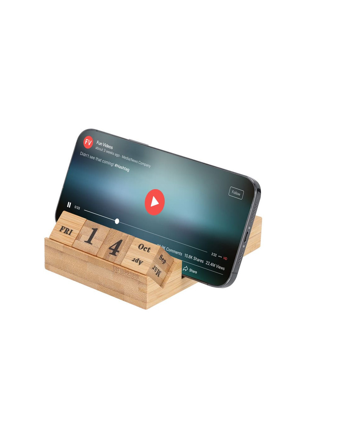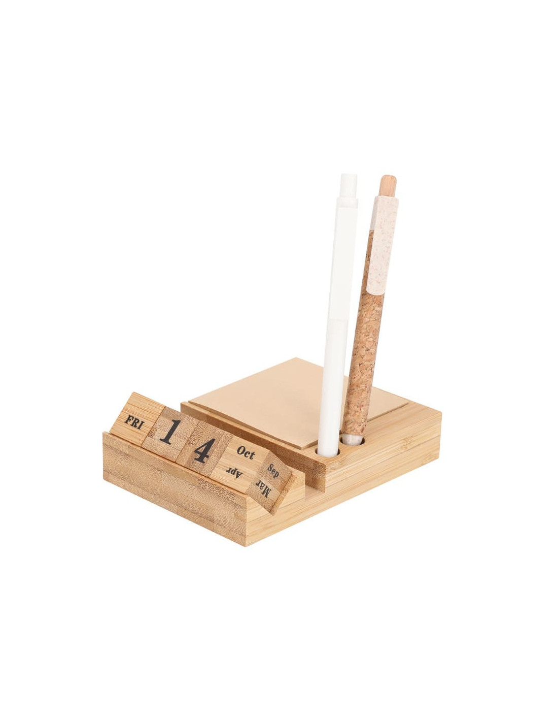 Portanotas con calendario perpetuo y soporte para smartphone fabricado en bambú, pensado para organizar la mesa de trabajo y dar un toque natural al escritorio. Los cubos móviles permiten marcar día, mes y fecha de manera sencilla. El soporte para smartphone permite poder tener siempre a la vista el móvil, cuenta con espacio para dos bolígrafos y un bloc de 100 notas adhesivas de papel kraft. Su diseño en bambú lo convierte en un accesorio sostenible, perfecto para oficinas, despachos o como regalo publicitario personalizado.