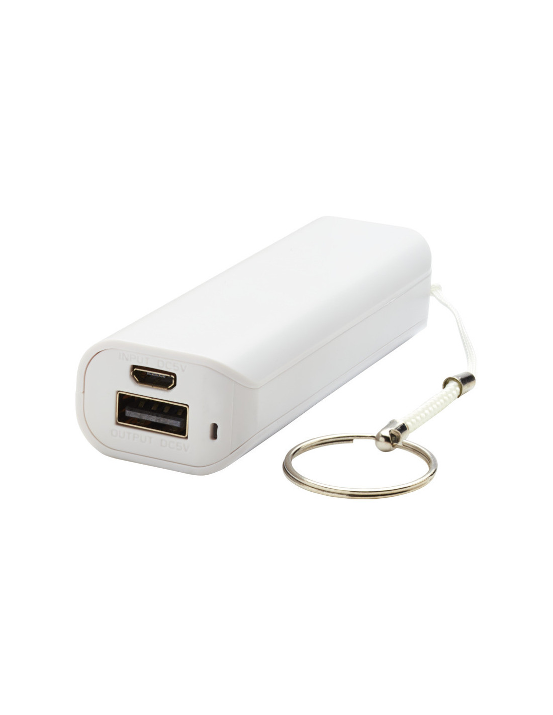 Power bank para cargar dispositivos móviles con 1200 mAh que proporciona una media carga de dispositivos para que nunca te quedes sin batería. Práctica batería externa recargable de iones de litio con anilla para colgar. Presentación en una caja de regalo, ideal para obsequios de empresas personalizados.