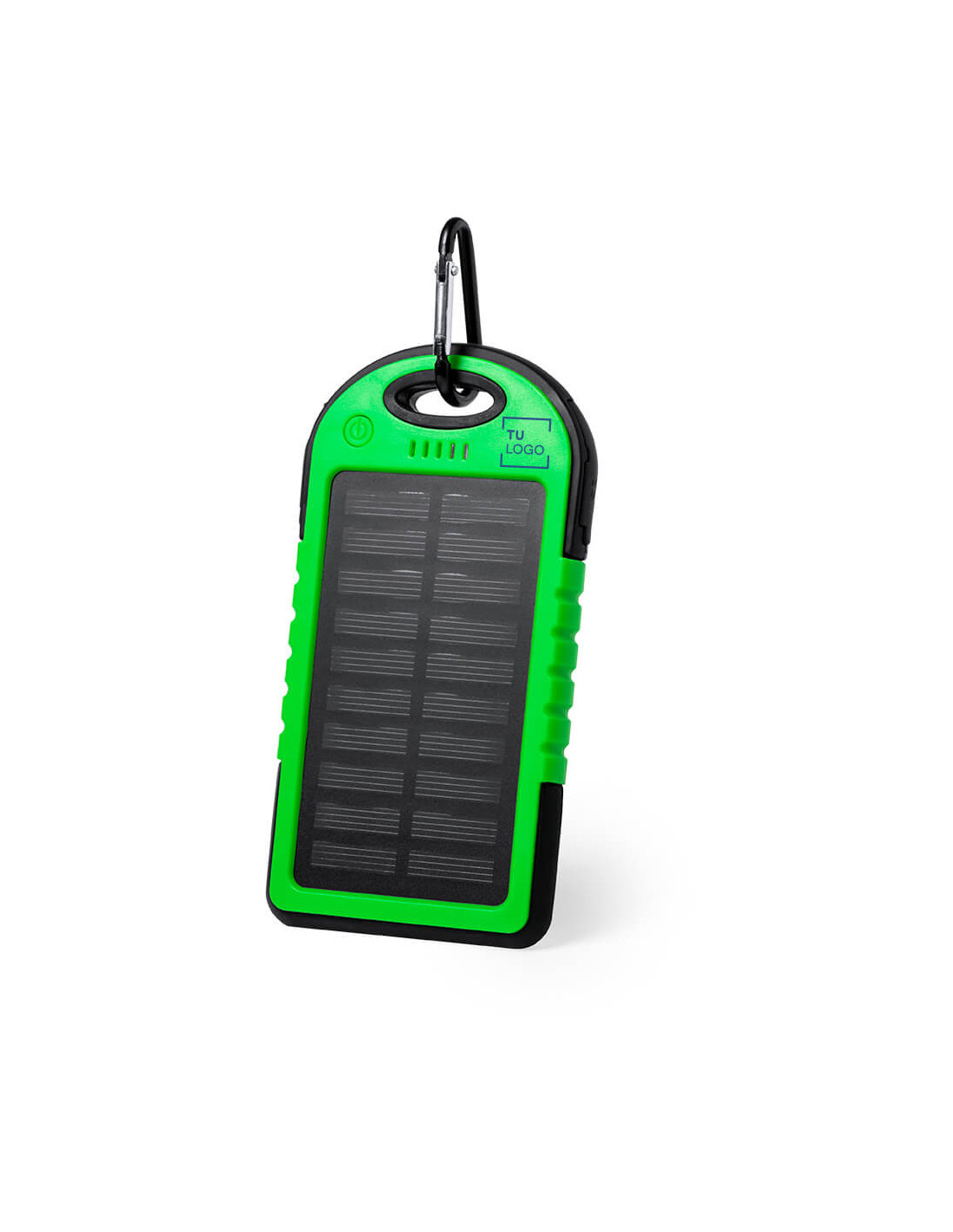 Batería externa para móviles con carga de tipo solar y resistente al agua. Capacidad de carga 4000 mAh. Bordes de silicona y diseño en diferentes colores. Salida de USB para dos dispositivos a la vez, luz LED indicadora de carga y con luz de señalización de emergencia. Mosquetón para el transporte de aluminio y cable USB incluido. Presentación en caja de cartón individual. Tiene sistema de protección contra sobrecarga y descarga para evitar cortacircuitos.