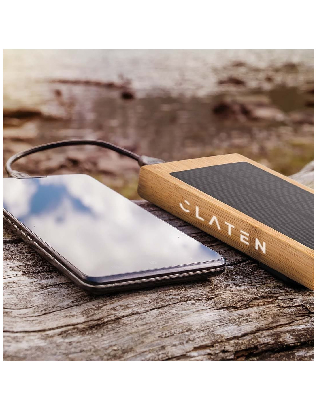 Esta power bank de bambú con certificación FSC® combina diseño sostenible y alto rendimiento gracias a sus 10.000 mAh de capacidad real. Es una power bank solar equipada con panel de carga y un sistema de carga inalámbrica de 5W compatible con dispositivos Qi, ideal para uso diario o actividades al aire libre. Incluye 2 salidas USB, entrada Micro USB y entrada USB C para adaptarse a cualquier dispositivo. Fabricada con baterías de grado A, ofrece una vida útil mínima de 500 ciclos y sistemas de protección contra sobrecarga, descarga completa, cortocircuitos y transferencia de carga constante. Un power bank de bambú versátil y ecológico, perfecto como regalo corporativo o promocional.