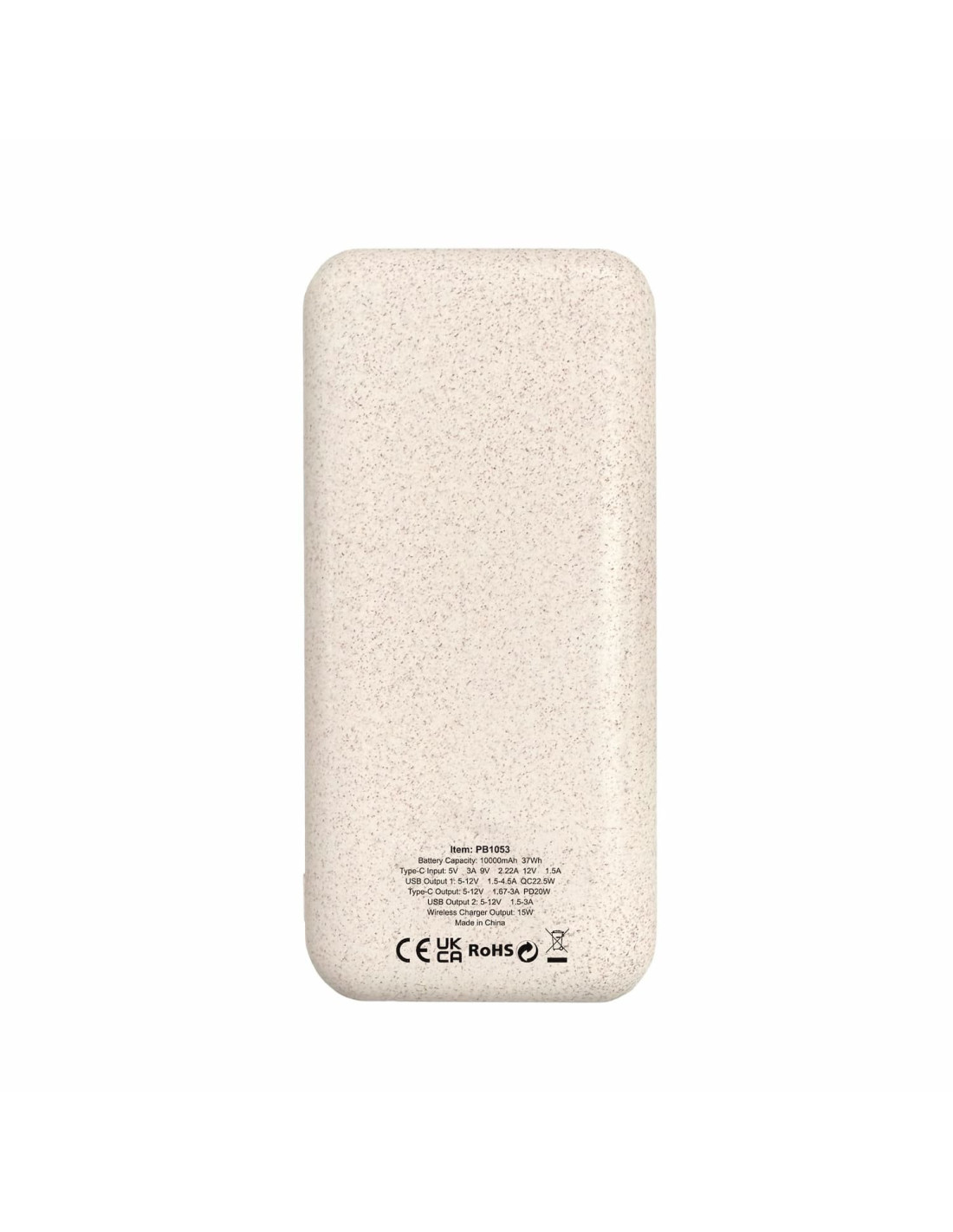 Potencia tus campañas promocionales con esta batería externa de 10.000 mAh fabricada en una atractiva combinación de bambú y fibra de trigo, materiales sostenibles que aportan un acabado natural y diferenciador. Cuenta con carga inalámbrica integrada de 15W compatible con dispositivos preparados para tecnología Qi, ofreciendo una carga cómoda sin cables. Sus indicadores luminosos permiten conocer en todo momento el nivel de energía disponible, mientras que las conexiones USB y Tipo C, con entrada y salida de corriente, permiten cargar varios dispositivos a la vez con total seguridad. Una power bank ecológica, versátil y perfecta para empresas que buscan regalos funcionales y con valores asociados a la sostenibilidad.
