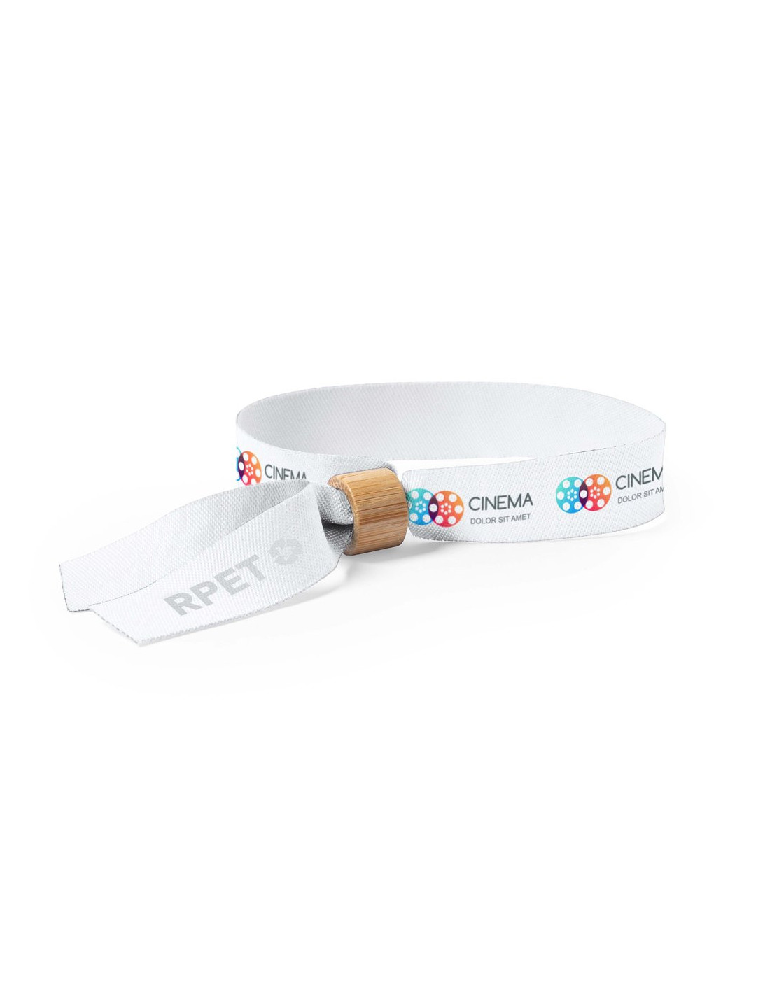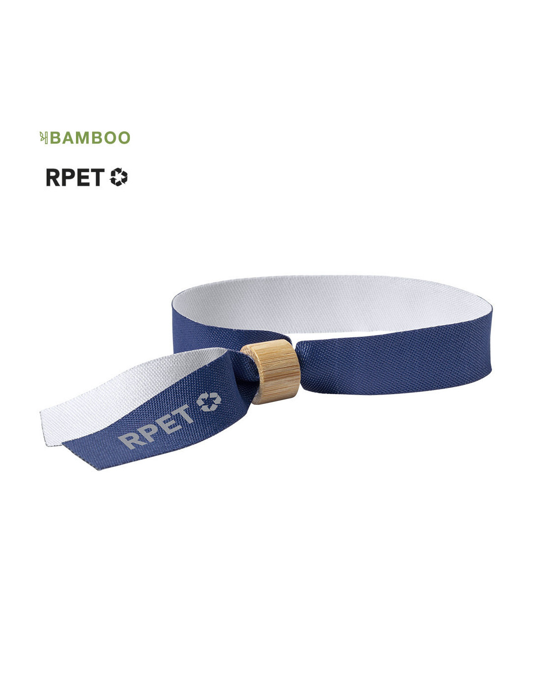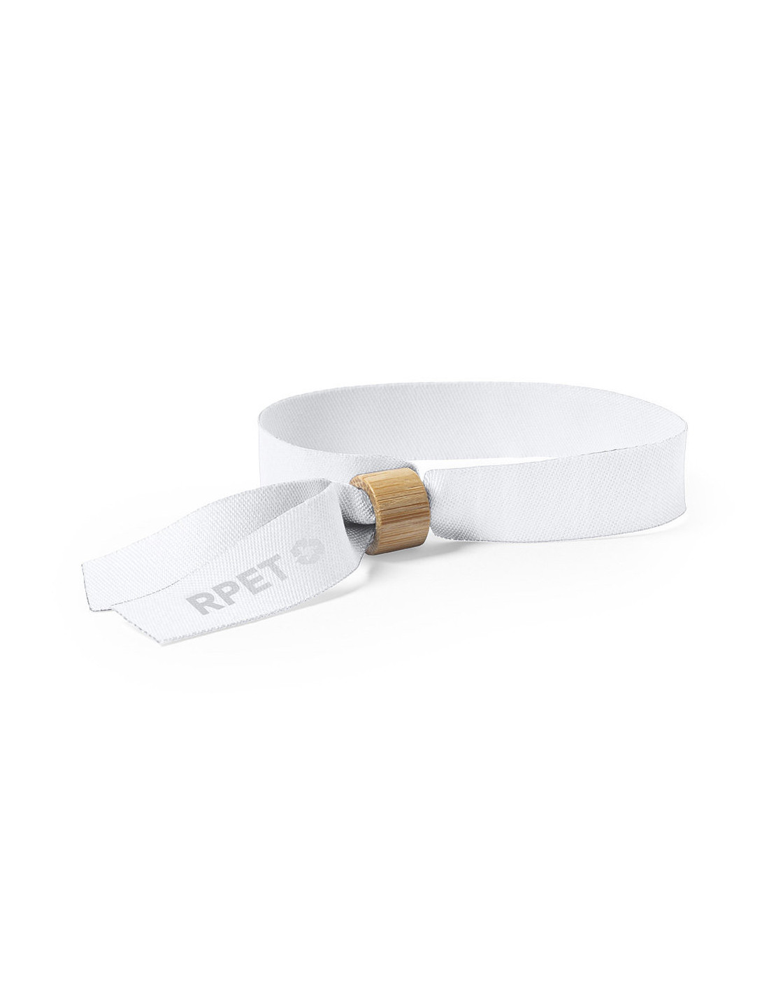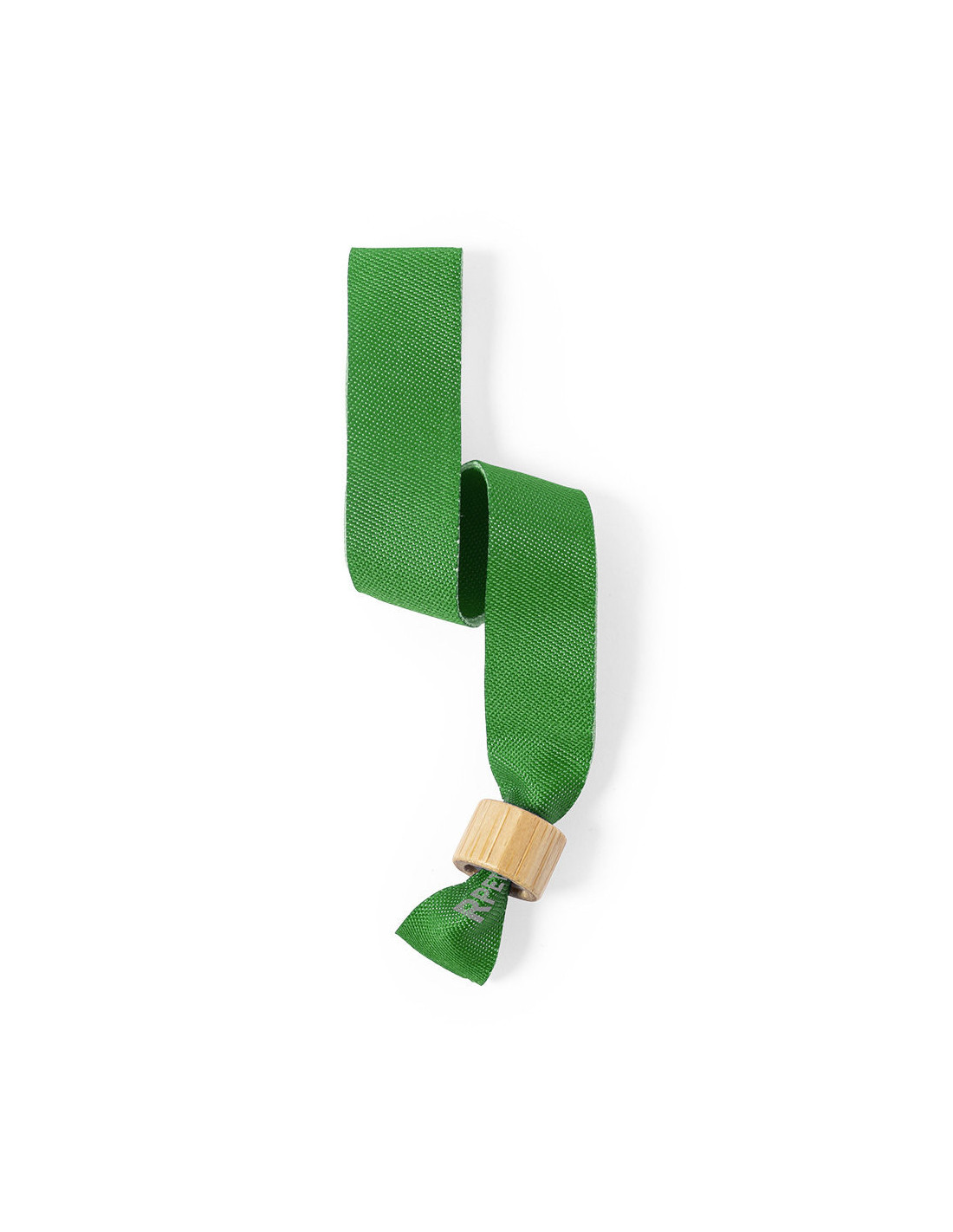Pulsera para eventos de la línea nature, fabricada en poliéster RPET de 160 g/m², un material sostenible elaborado a partir de plástico reciclado que contribuye a la reutilización de residuos y al cuidado del medio ambiente. Cuenta con un práctico ajustador en bambú que permite adaptar la pulsera cómodamente a diferentes tamaños de muñeca, garantizando seguridad y confort. Disponible en una variada gama de colores, incluyendo el blanco especialmente diseñado para sublimación, ideal para personalizar con logotipos o diseños promocionales. Lleva impreso el distintivo RPET que destaca su carácter ecológico. Medidas: 35 x 1,5 cm.