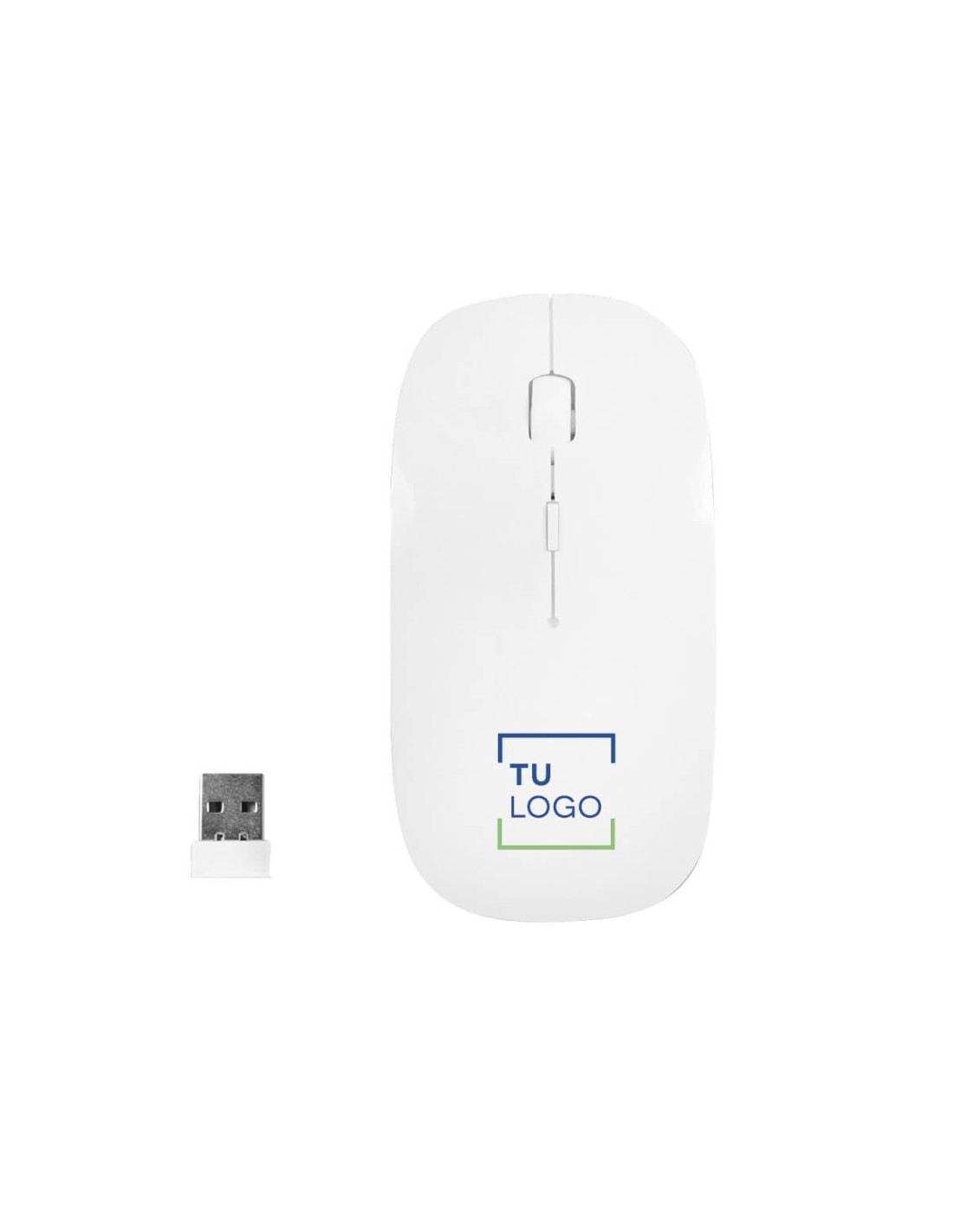 Ratón inalámbrico fabricado en plástico reciclado de color blanco. Dos botones centrales y rueda giratoria. Botón DPI para regular la sensibilidad del ratón.