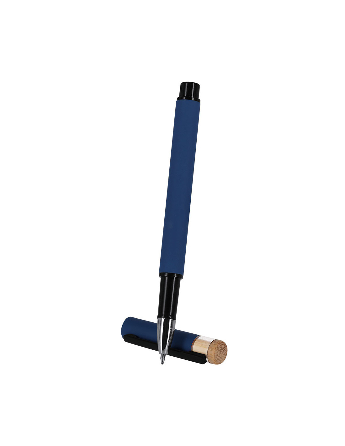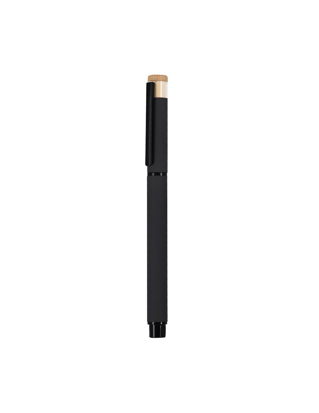 Elegante roller fabricado en bambú y aluminio reciclado, una combinación de materiales que aporta estilo, resistencia y un enfoque sostenible. Su cuerpo presenta un agradable acabado gomoso que mejora el agarre y la comodidad durante la escritura. Incorpora clip y empuñadura en color negro que aportan un contraste moderno y profesional. Este roller cuenta con cierre de capucha y cartucho jumbo con tinta azul, lo que garantiza una escritura fluida y duradera. Además, incluye el distintivo de aluminio reciclado que refuerza su carácter ecológico, convirtiéndolo en una excelente opción como regalo promocional para empresas que desean transmitir una imagen responsable y actual. Con una longitud aproximada de 14 cm, es perfecto para ferias, congresos y campañas de marketing corporativo.