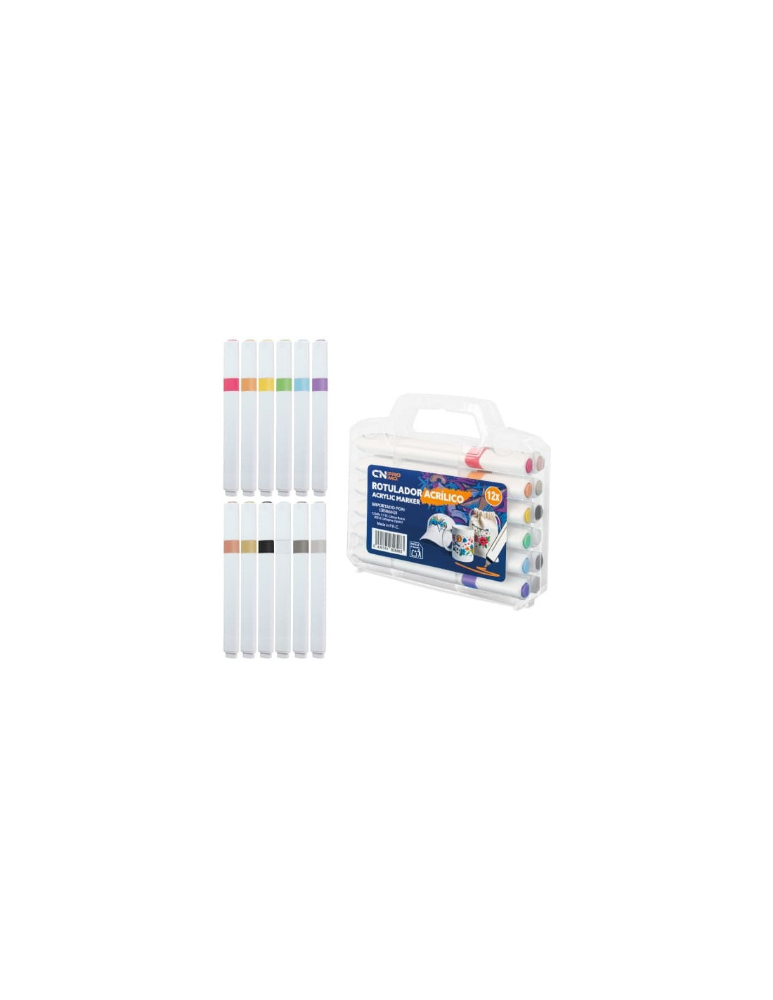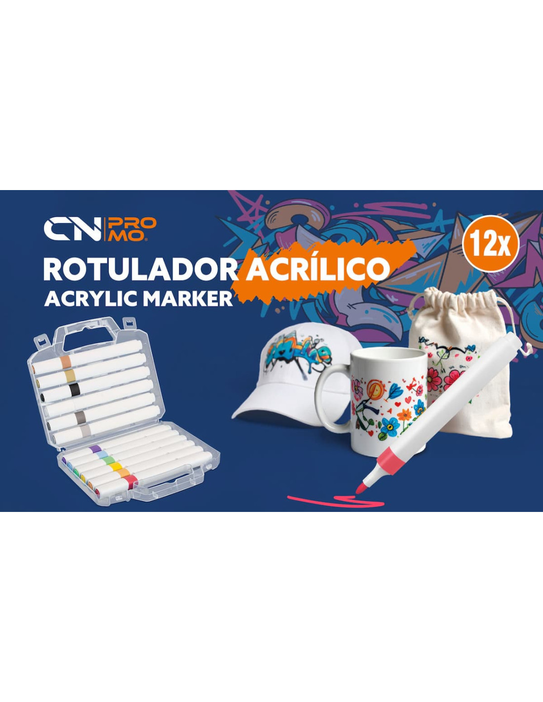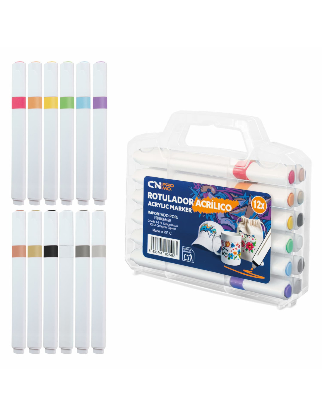 Set de 12 rotuladores acrílicos de colores surtidos, presentados en un práctico maletín transparente para mantenerlos organizados y siempre a mano. Su tinta ofrece una cobertura uniforme y permite decorar con precisión sobre distintos materiales como tazas, gorras, bolsas o cartón. Los rotuladores están fabricados en ABS, lo que garantiza una gran durabilidad y un uso cómodo. Ideal para talleres creativos, manualidades o como detalle promocional para empresas relacionadas con el arte y la personalización.