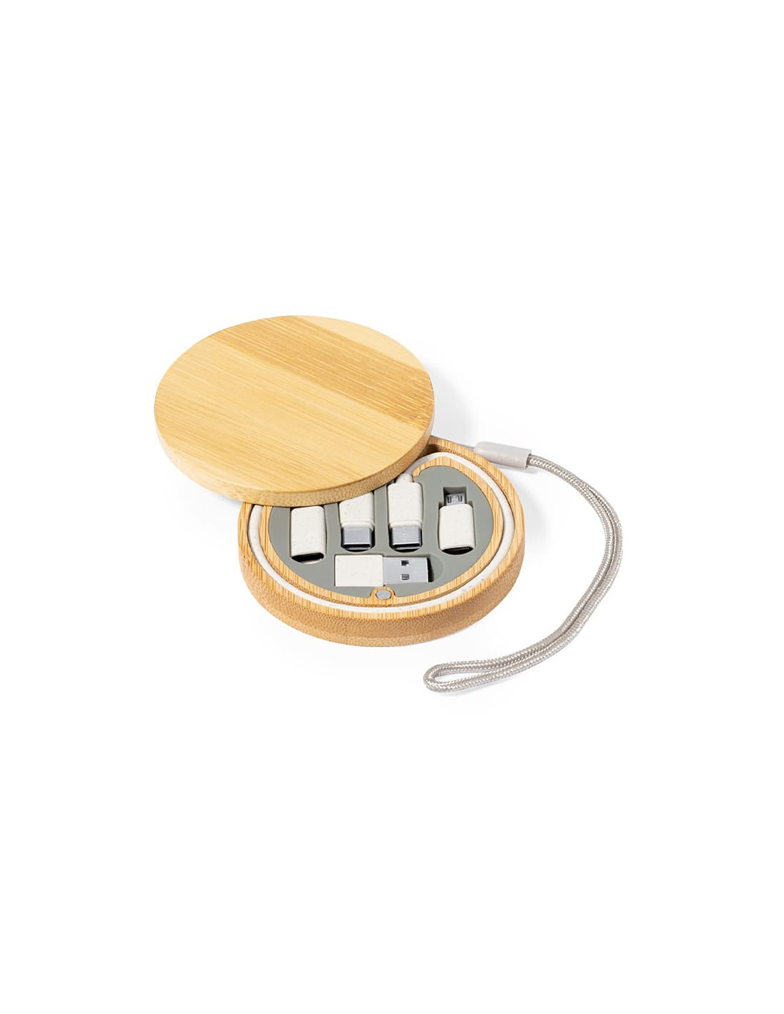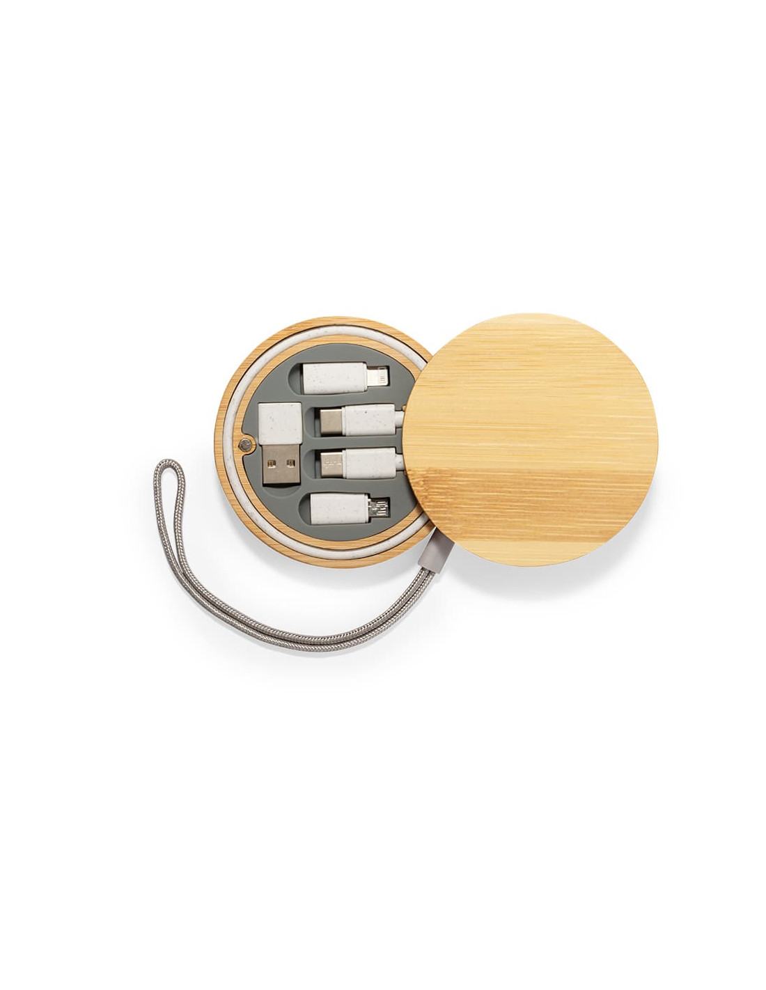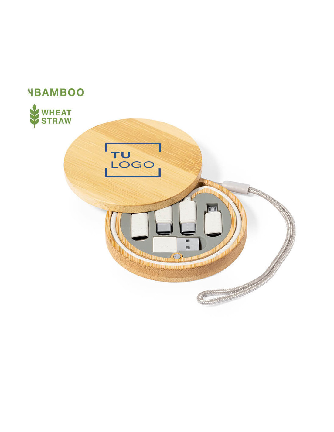Completo set de cables cargadores fabricado en fibra de trigo, con estuche de bambú pulido y asa de transporte. Apto para transferir datos. Conexión Micro USB, Tipo C y Lightning 5V DC 3A