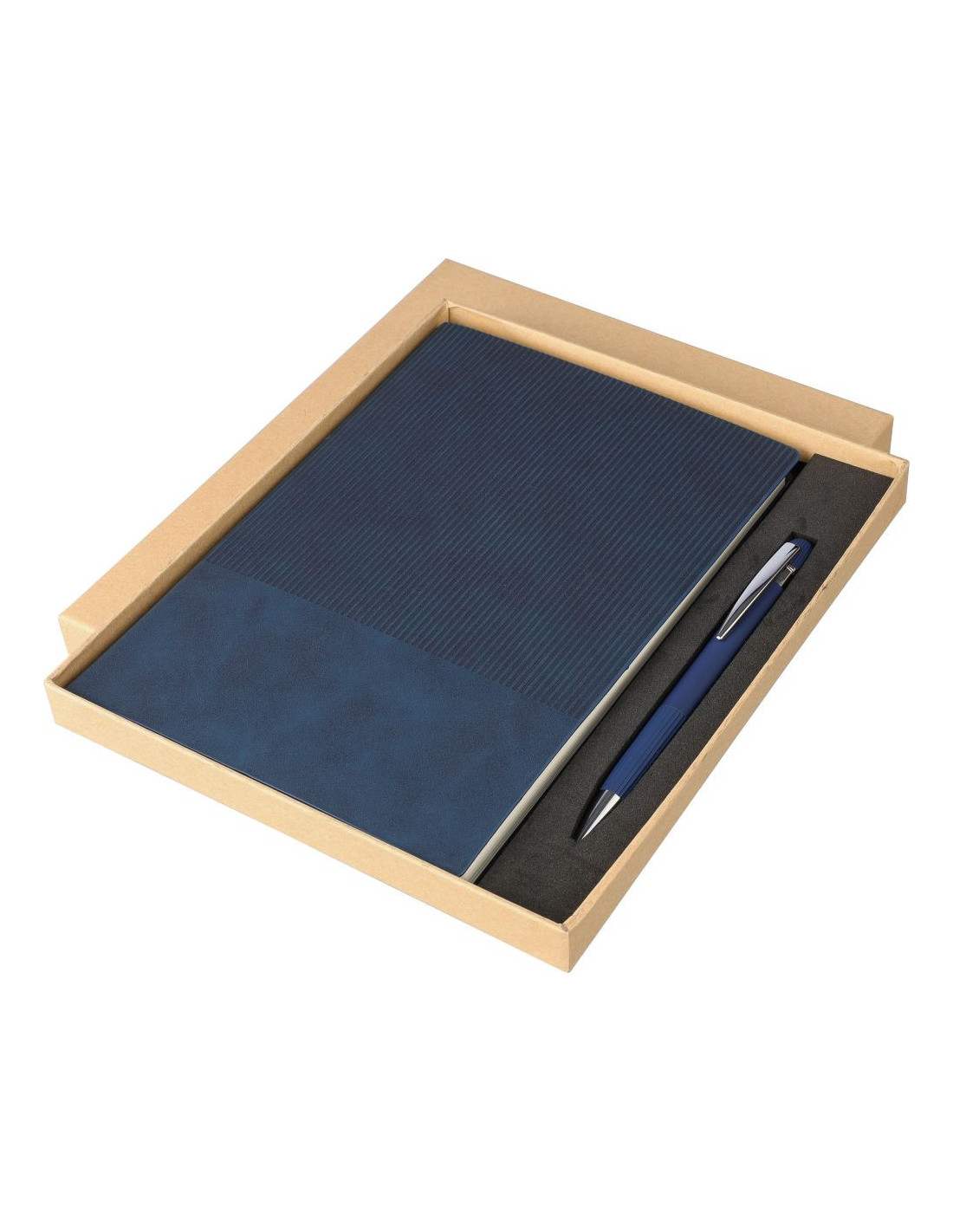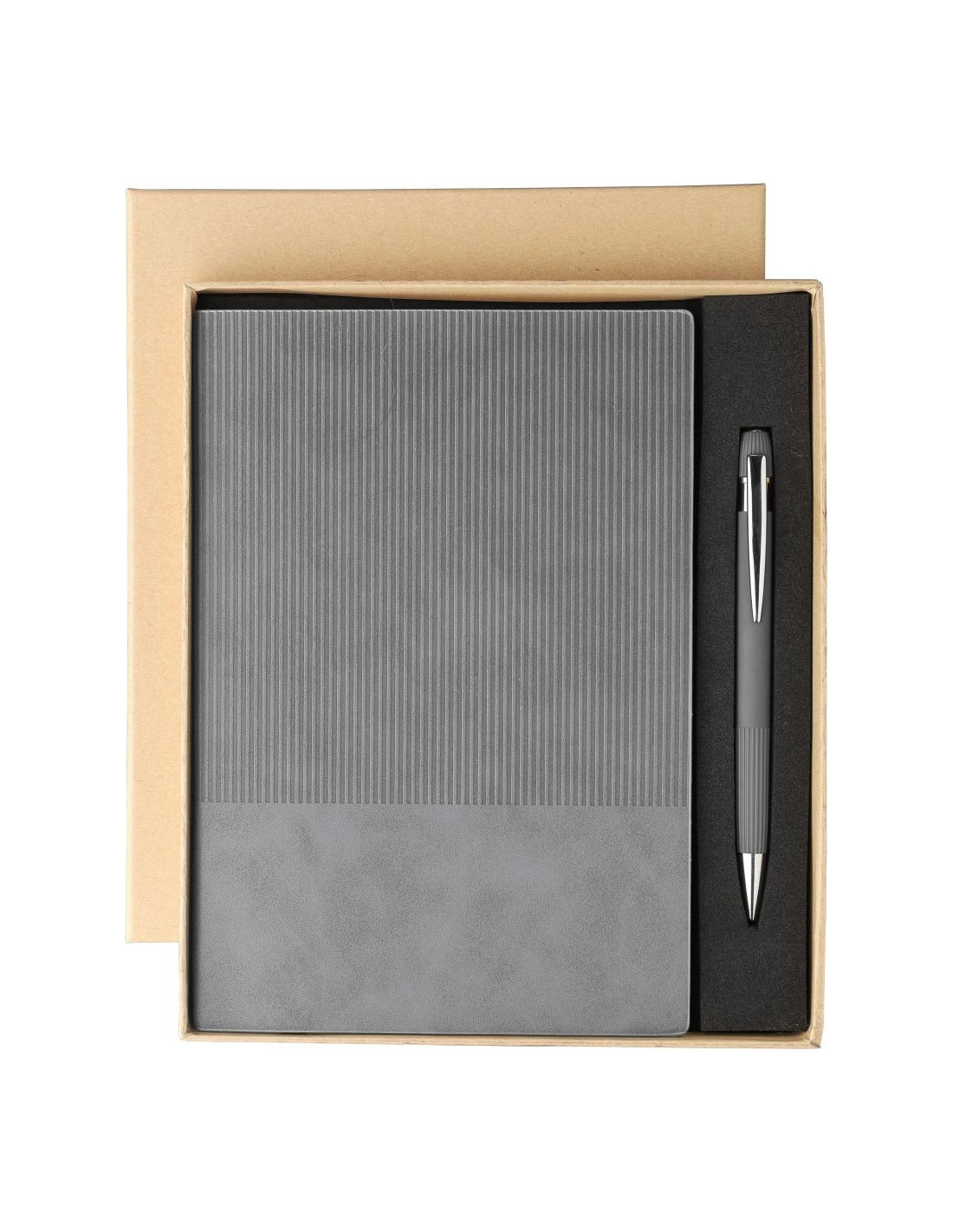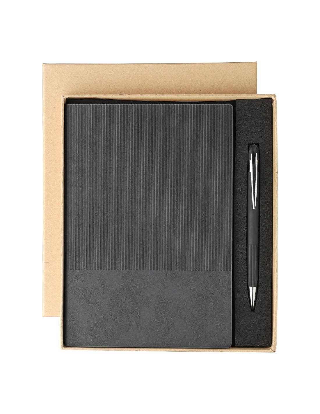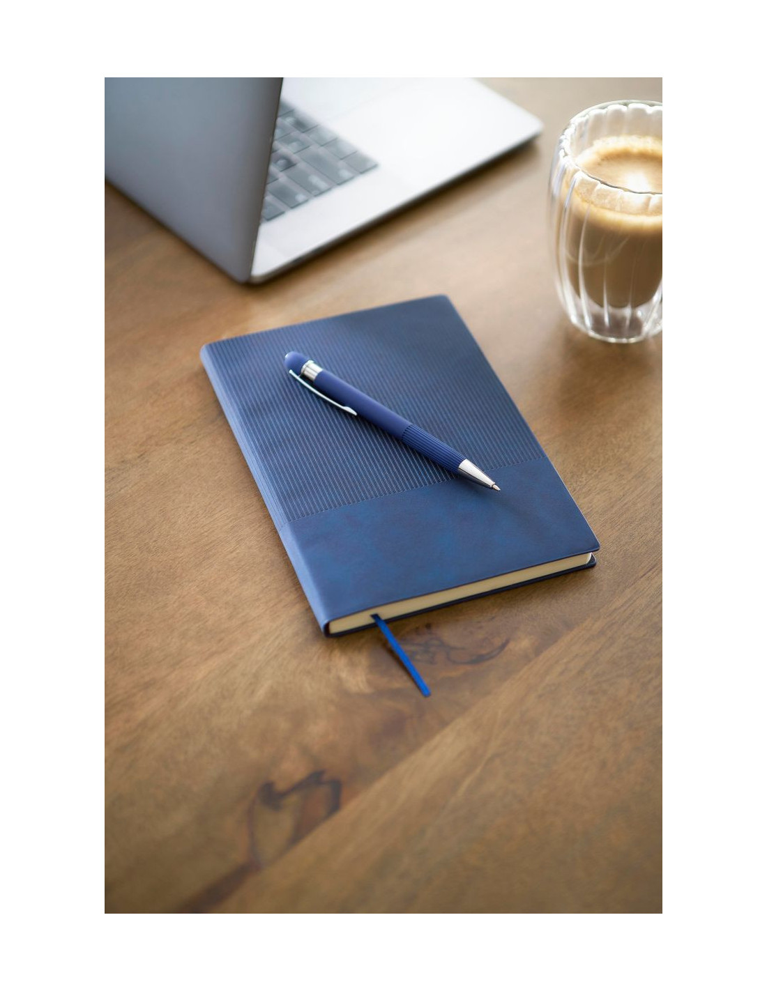 Set de escritura sostenible compuesto por una libreta A5 de PU reciclado y un bolígrafo de aluminio reciclado con acabado engomado. La libreta incluye 100 páginas rayadas de 80 g/m², cinta marcapáginas y cubiertas con efecto pana, aportando una textura elegante y profesional. En la parte posterior, destaca el logotipo reciclado grabado en relieve, símbolo de compromiso medioambiental.