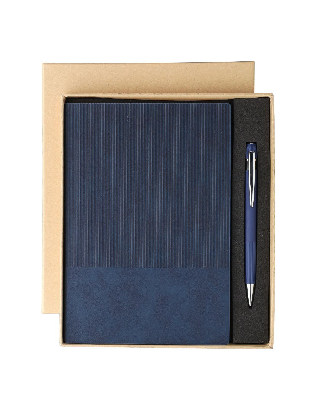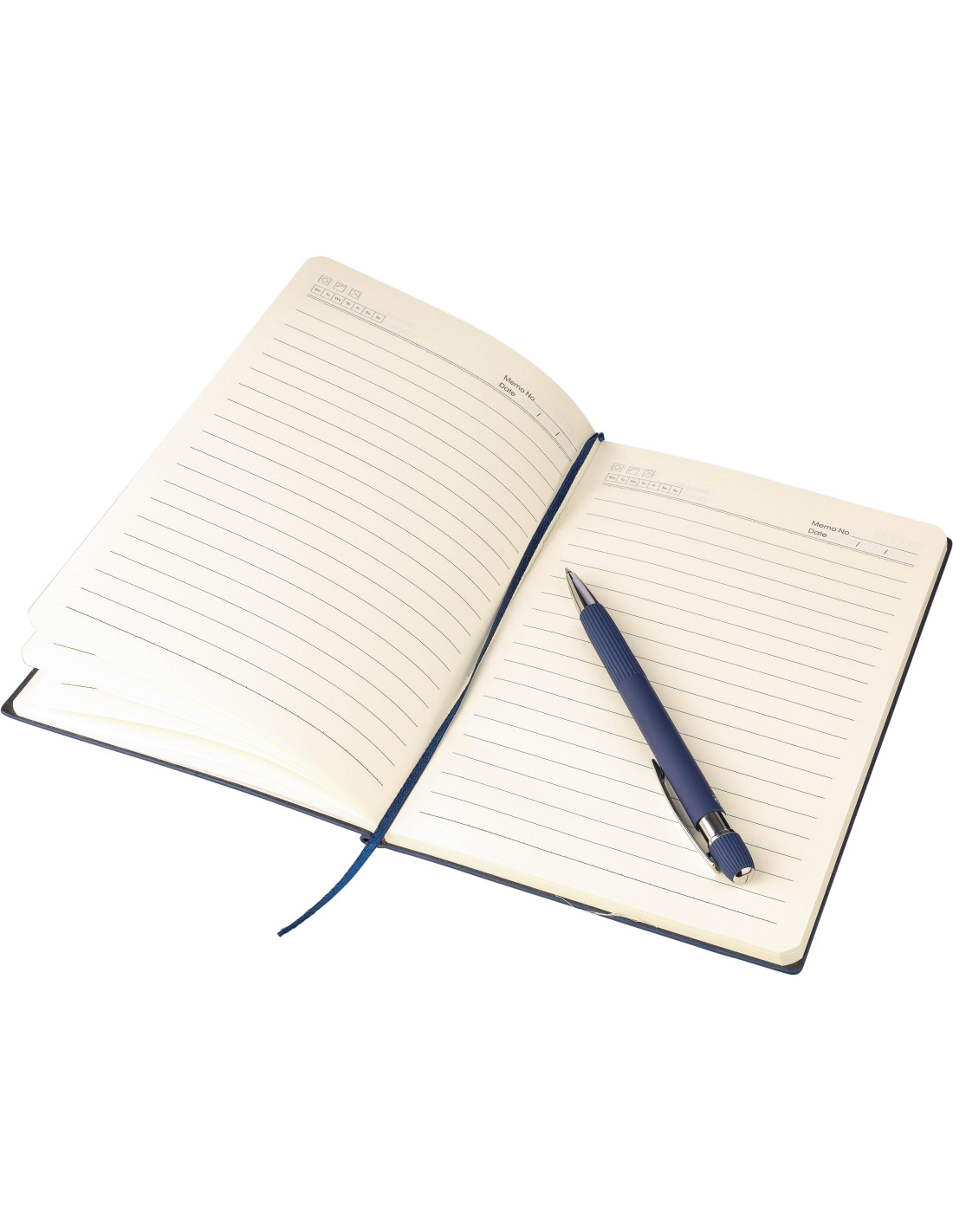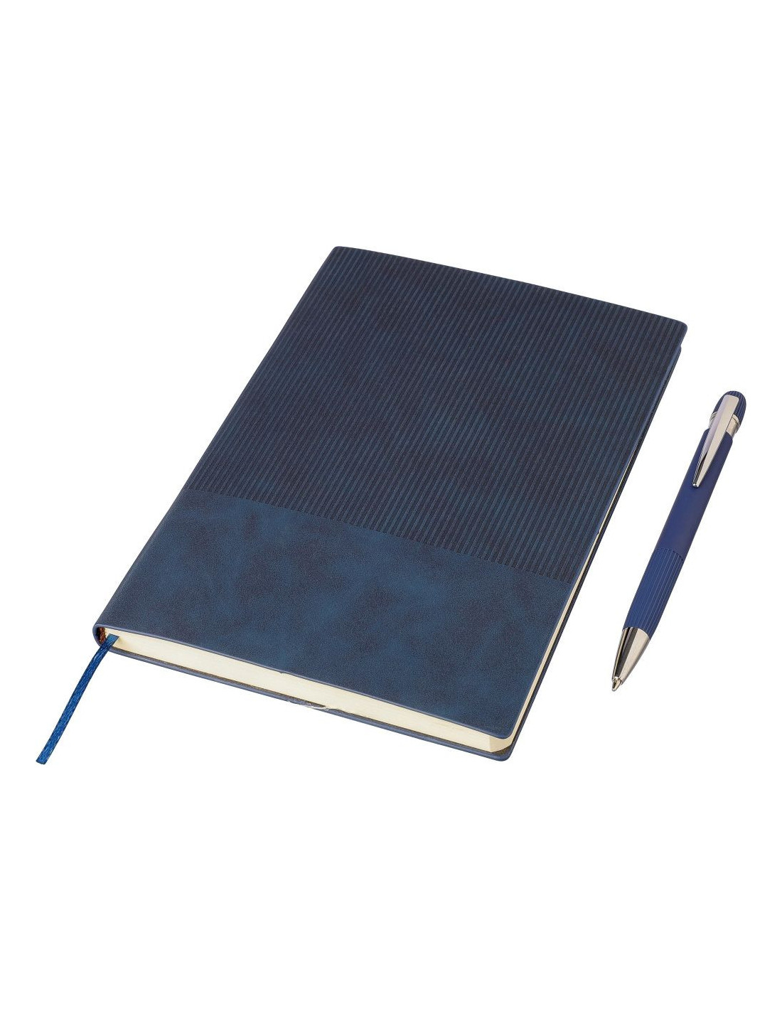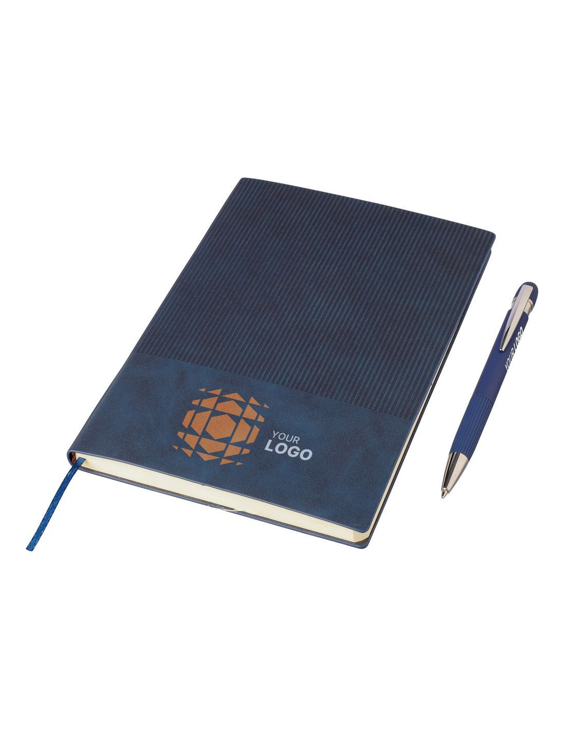 Set de escritura sostenible compuesto por una libreta A5 de PU reciclado y un bolígrafo de aluminio reciclado con acabado engomado. La libreta incluye 100 páginas rayadas de 80 g/m², cinta marcapáginas y cubiertas con efecto pana, aportando una textura elegante y profesional. En la parte posterior, destaca el logotipo reciclado grabado en relieve, símbolo de compromiso medioambiental.