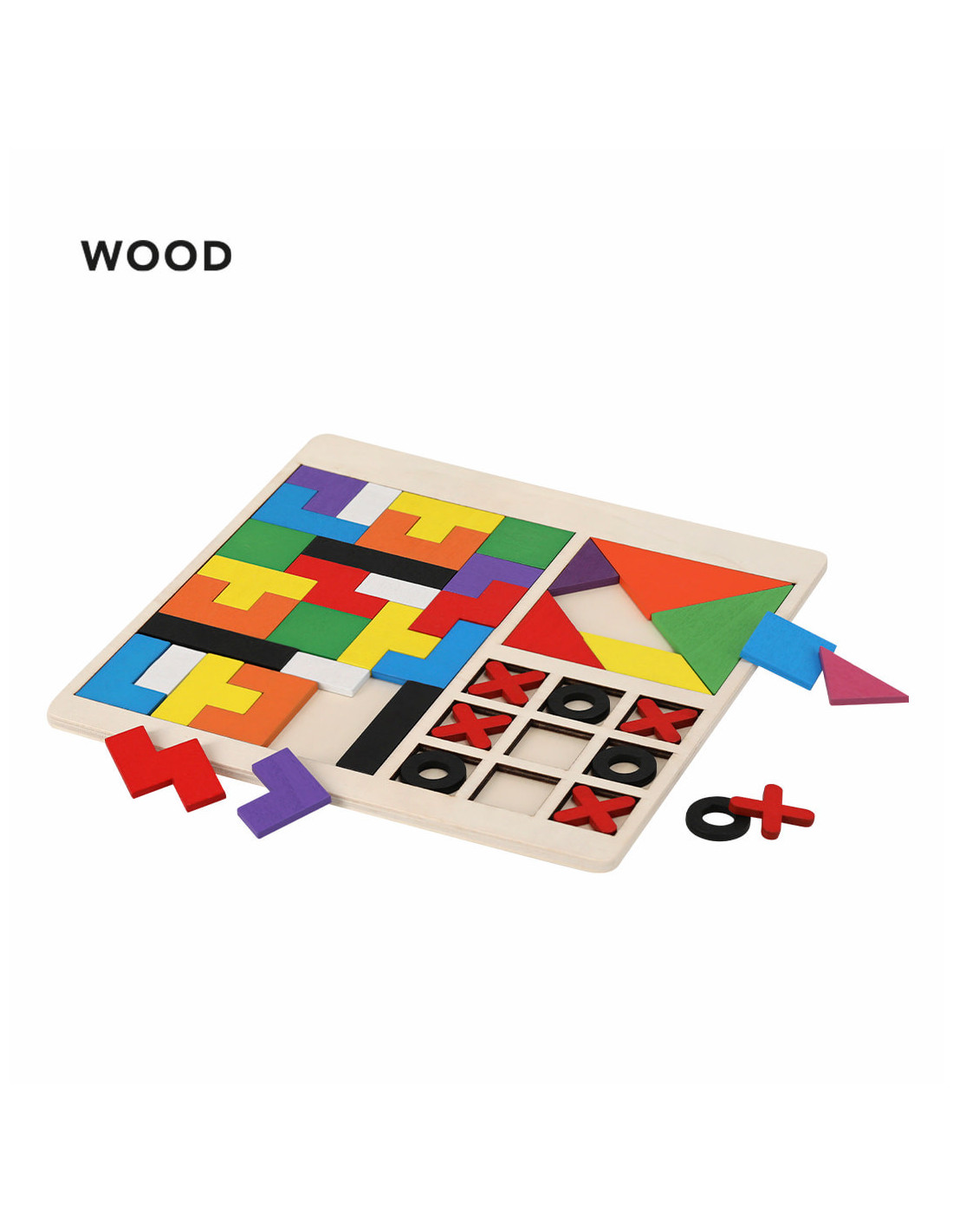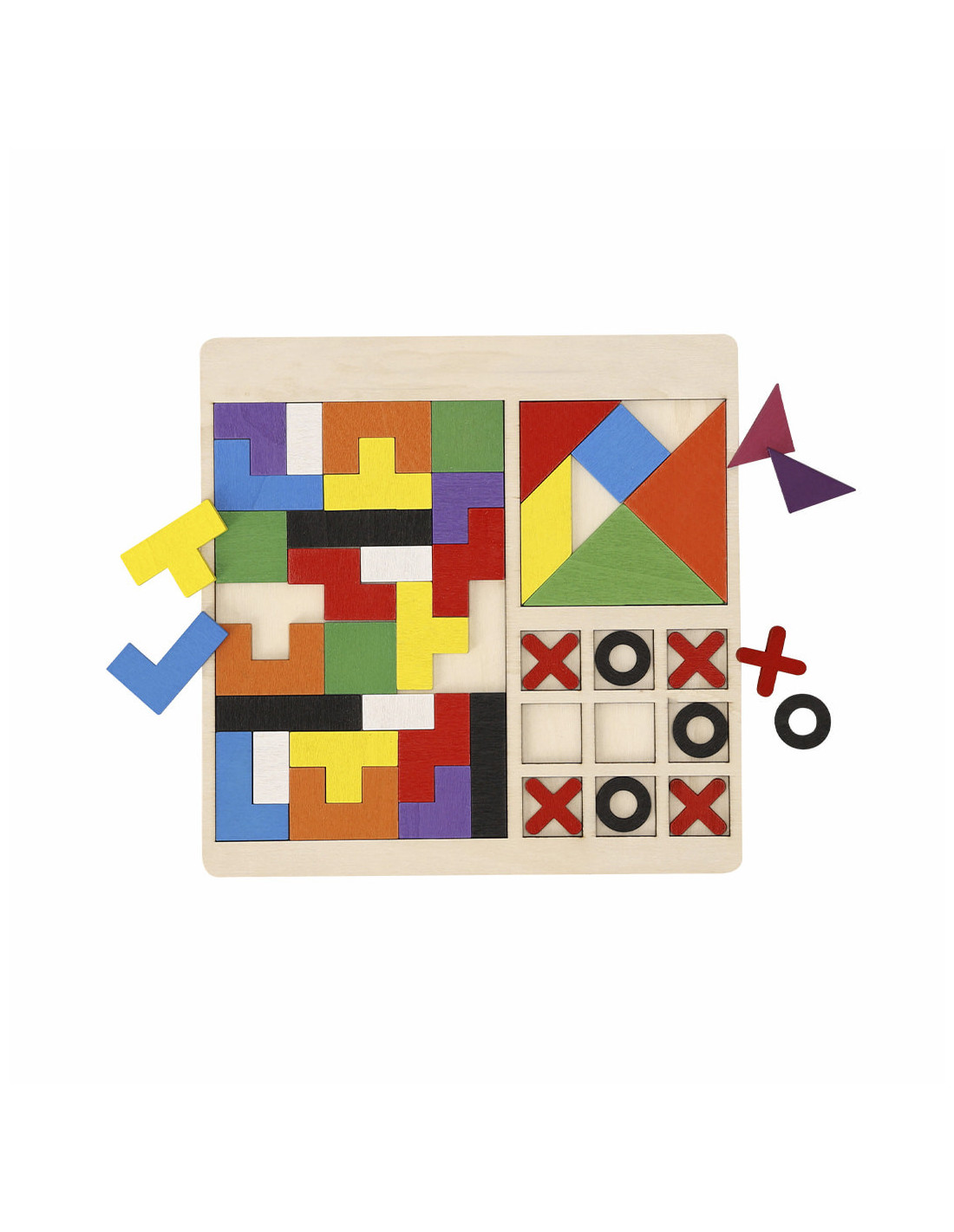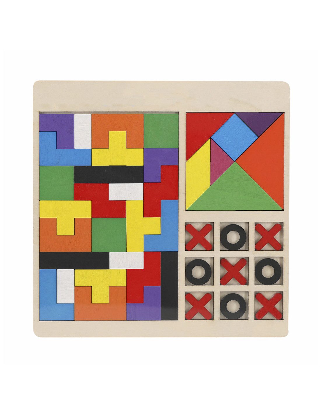 Set de puzzles de madera que incluye 3 juegos distintos, diseñado para estimular la creatividad, la coordinación y la diversión en niños. El puzzle grande contiene 26 piezas en forma de letra, fabricadas en madera suave y pintadas con colores vivos y llamativos. El puzzle pequeño incluye 7 piezas poligonales que permiten formar diversas figuras, fomentando el pensamiento lógico y la imaginación. El set incluye también un juego de tres en raya con 5 piezas rojas y 4 negras, ideal para desarrollar estrategias y habilidades sociales. Con unas dimensiones aproximadas de 22,3 x 22,3 x 0,5 cm, este set es un recurso educativo divertido y versátil para casa o como regalo para colegios.