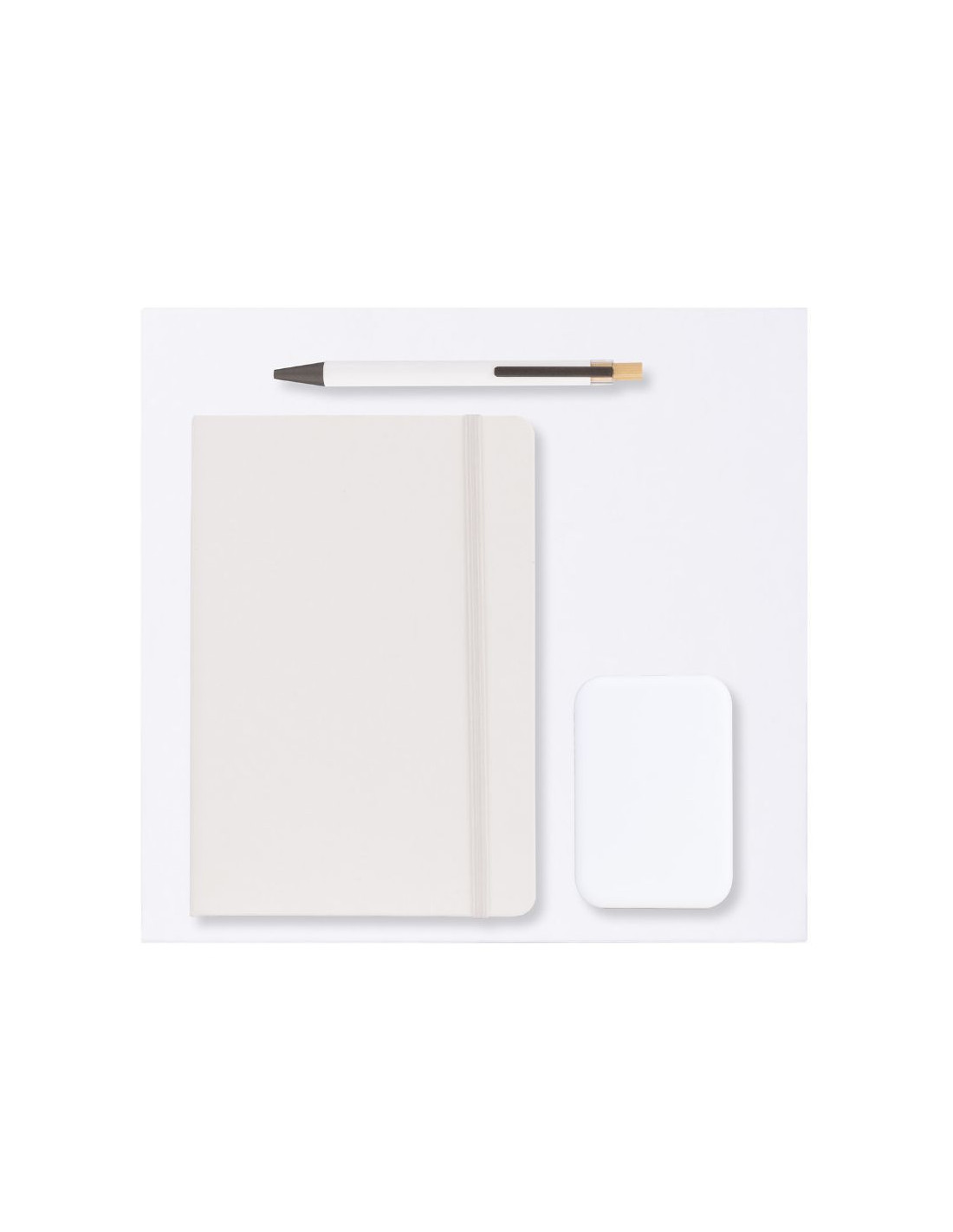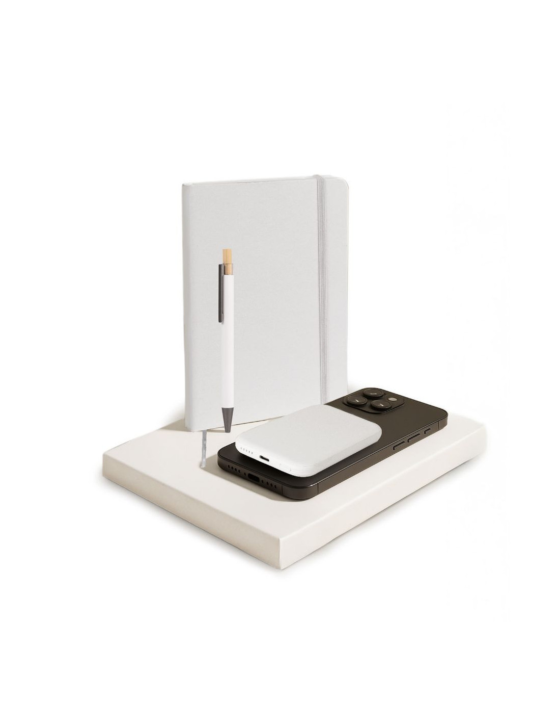 Set de escritura y tecnología compuesto por una libreta A5 con cierre de goma y 96 páginas lisas, bolígrafo con mecanismo pulsador y PowerBank de 5000 mAh con carga inalámbrica y carga rápida. Cuenta con puerto USB-C. Presentado en una caja de regalo con molde interior para mantener cada elemento organizado, este set en color blanco es una opción práctica y elegante para regalos de empresa, eventos tecnológicos o detalles navideños corporativos.