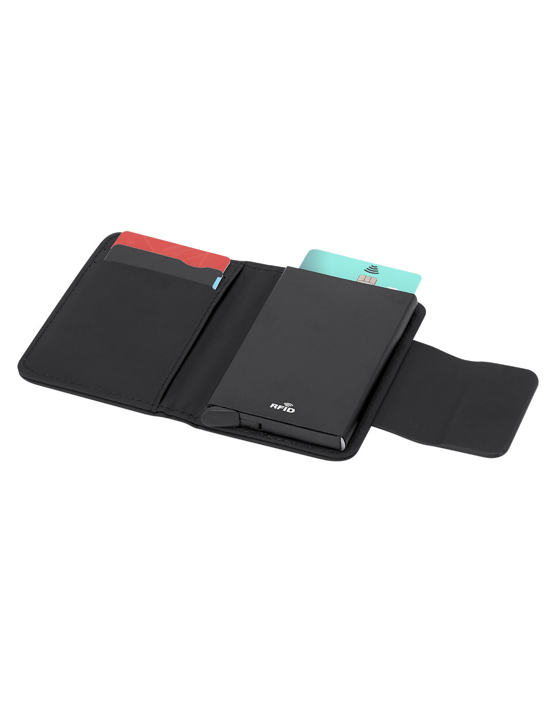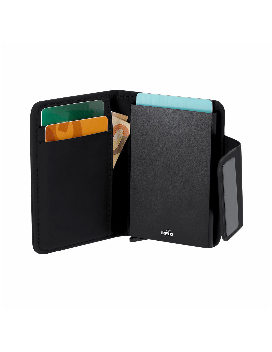 Tarjetero fabricado en PU reciclada, un producto sostenible y muy práctico. Cuenta con capacidad para hasta 10 tarjetas y un ingenioso mecanismo desliza y extrae que facilita el acceso rápido. Dispone de cierre magnético mediante solapa y 4 compartimentos para organizar tus tarjetas de forma óptima. Incorpora tecnología de protección RFID, manteniendo seguras las tarjetas contactless frente a cargos no autorizados. Dimensiones aproximadas: 10,6 x 7,7 x 2,6 cm.